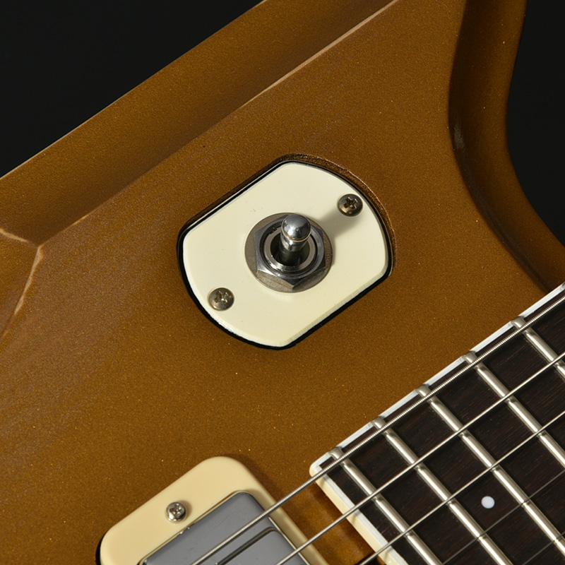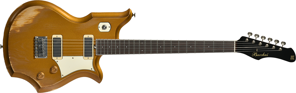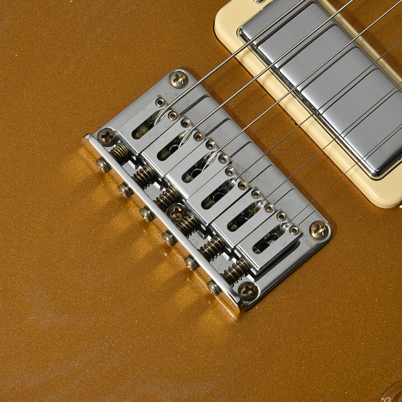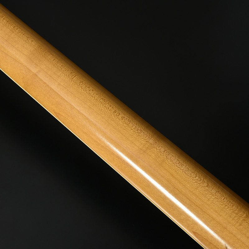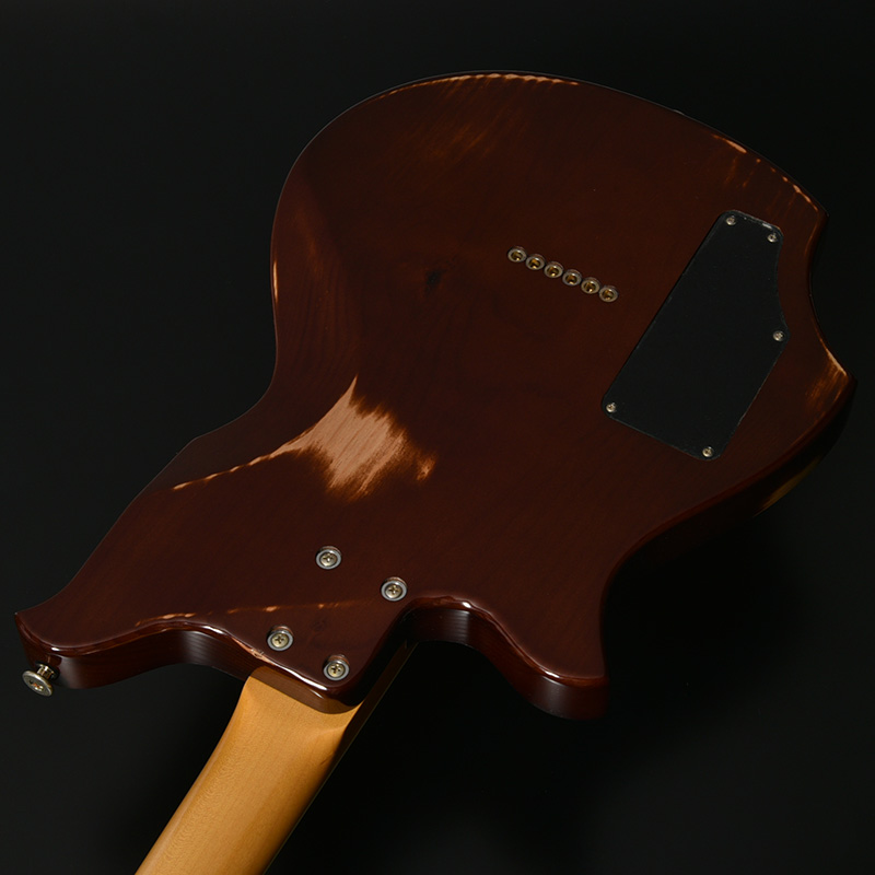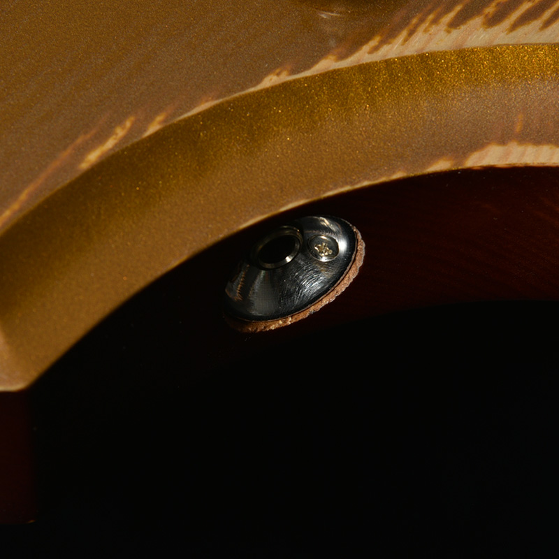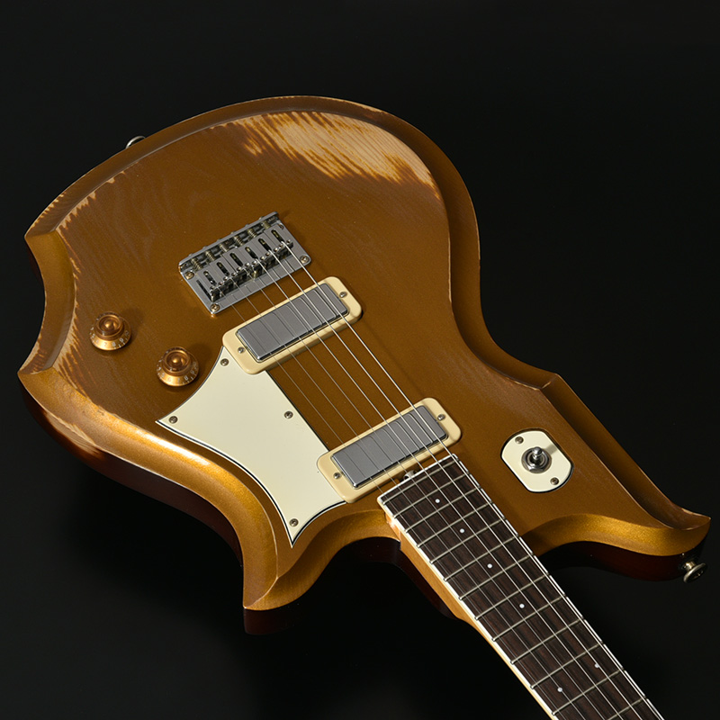 赤松の持つ節やシミなどをデザインへと昇華する、エイジド加工がボディとパーツに施されています。特別カラーとして、ビンテージ・ギターにインスパイアされたGold Topカラー、そしてブラックにフィニッシュされたヘッドストックが印象的な一本です。