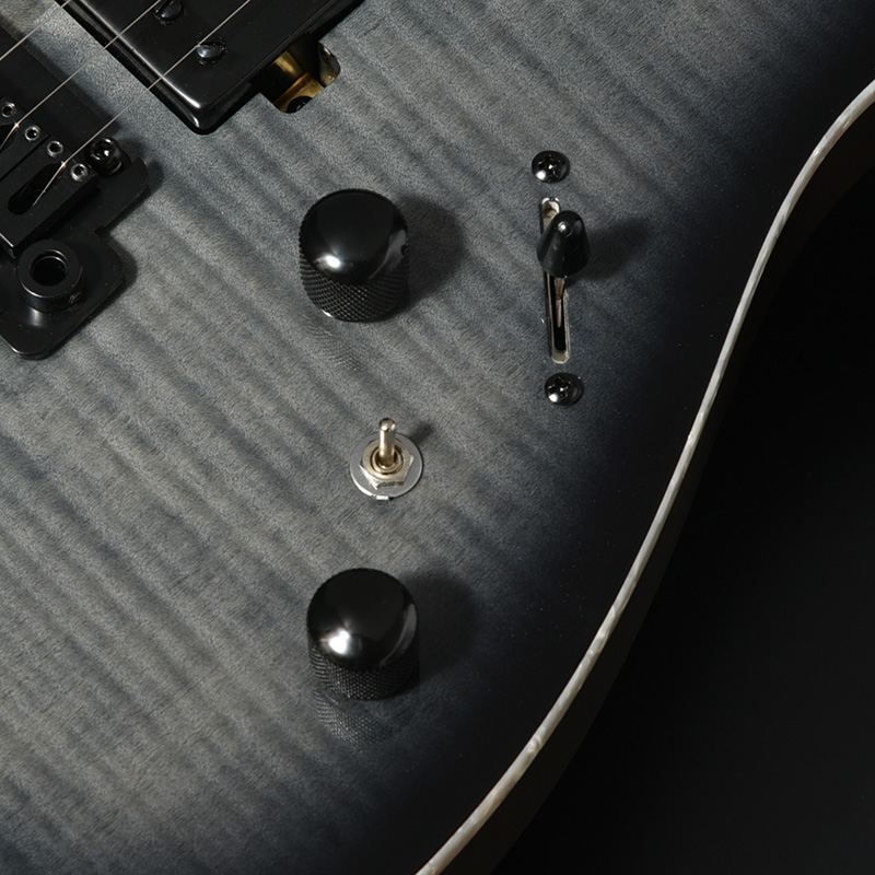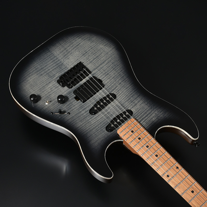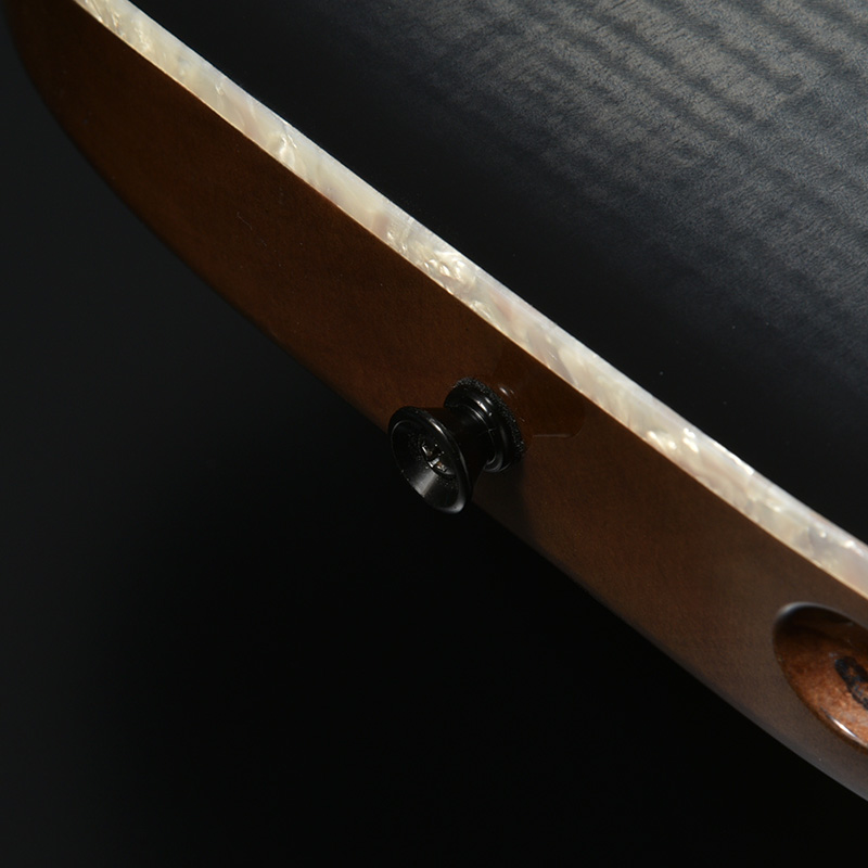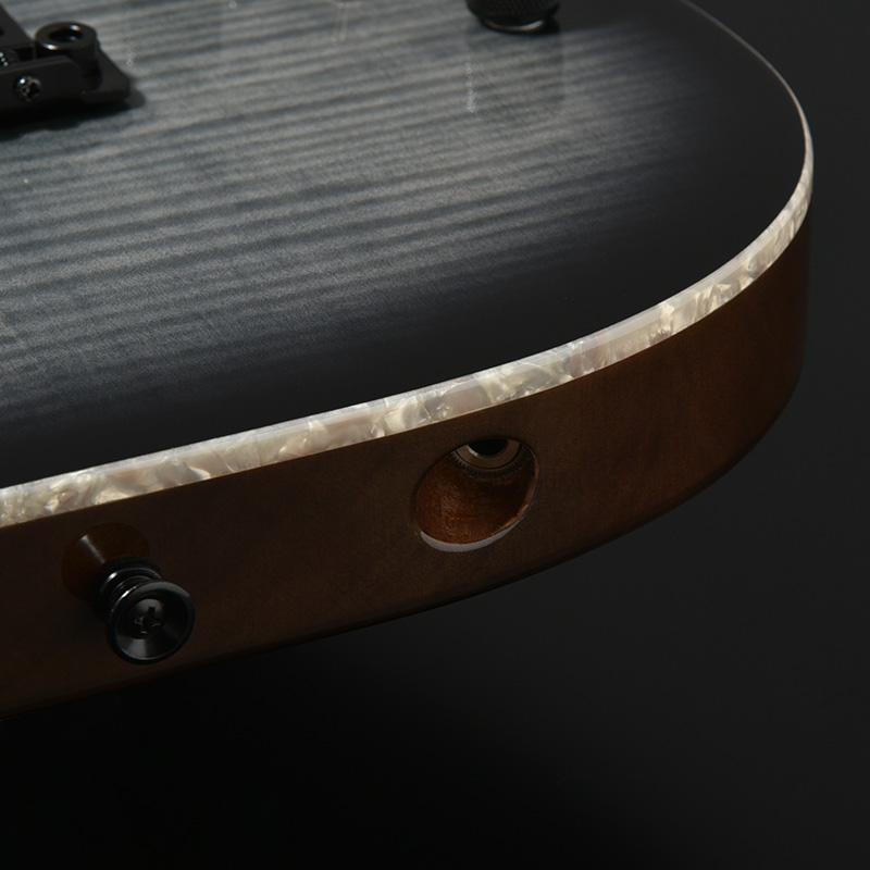 バランスの良いサウンドを持つオクメ材のボディのトップに、虎杢の美しいフレイムメイプルを合わせました。