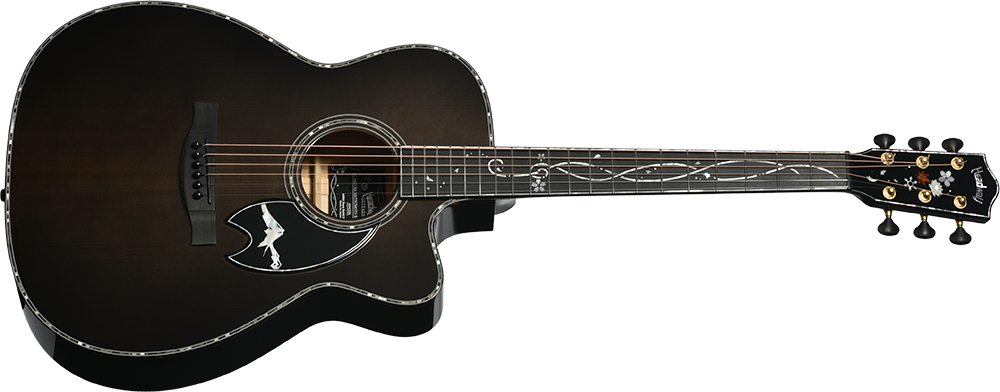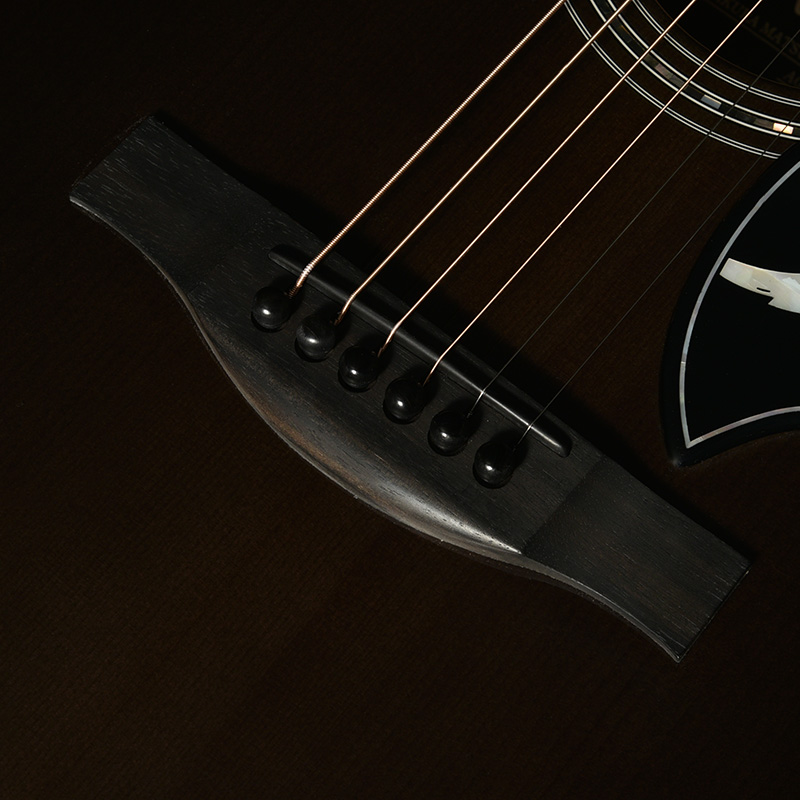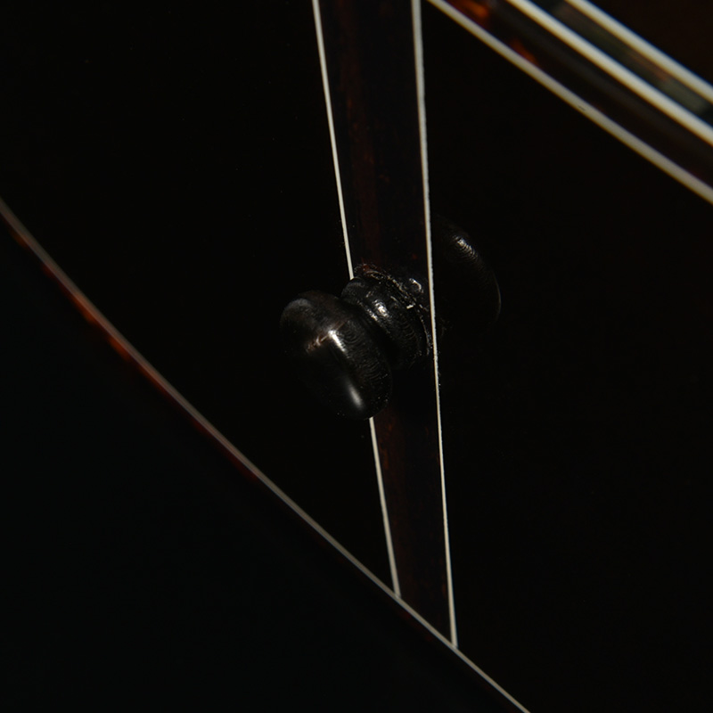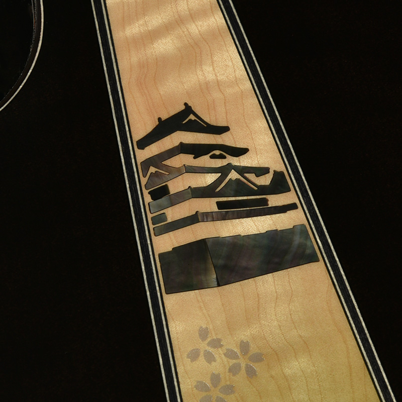 ボディのカラーリングは松本城の天守をイメージした”黒”で仕上げました。桜材の杢目を見せる黒の色合いは表現が難しく、数々のギターを塗り分けてきた職人の技と感覚で調色されています。