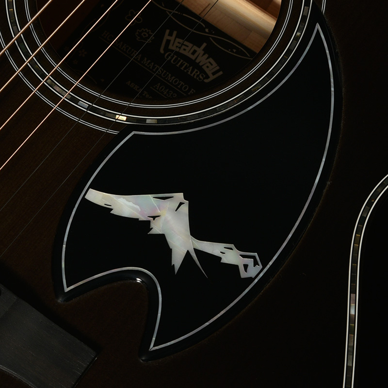 3個のガク「学」「楽」「岳」からなる、松本市の三ガク都からギターへ繋がりのある「楽」をト音記号として指板にデザインし表現しています。