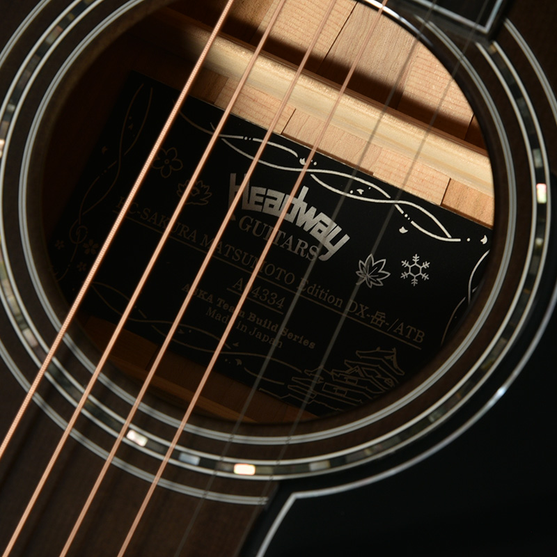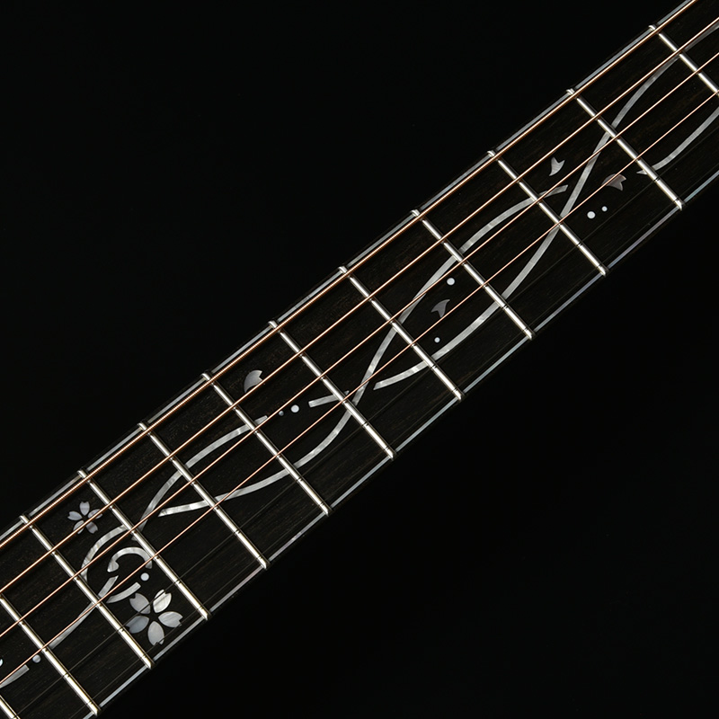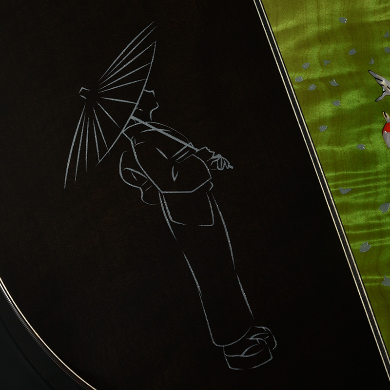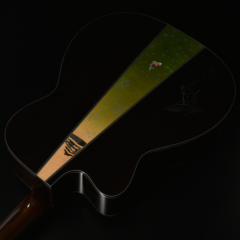 「桜ギター」の一番の特色であるボディサイド・バックの桜材は、私たちが”桜サウンド”と表現する、中音域に特徴のある音色を聞かせます。さらにボディバックセンターでは新緑に包まれた夏山をイメージした鮮やかなグリーンを配色し、季節の移ろいを表現しています。