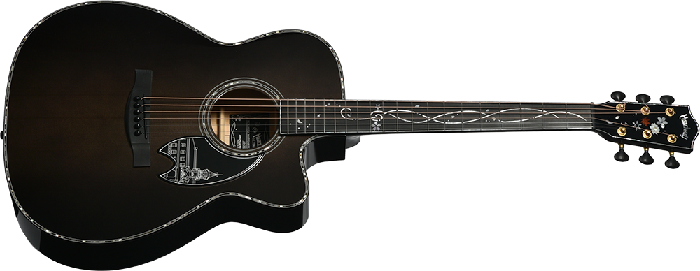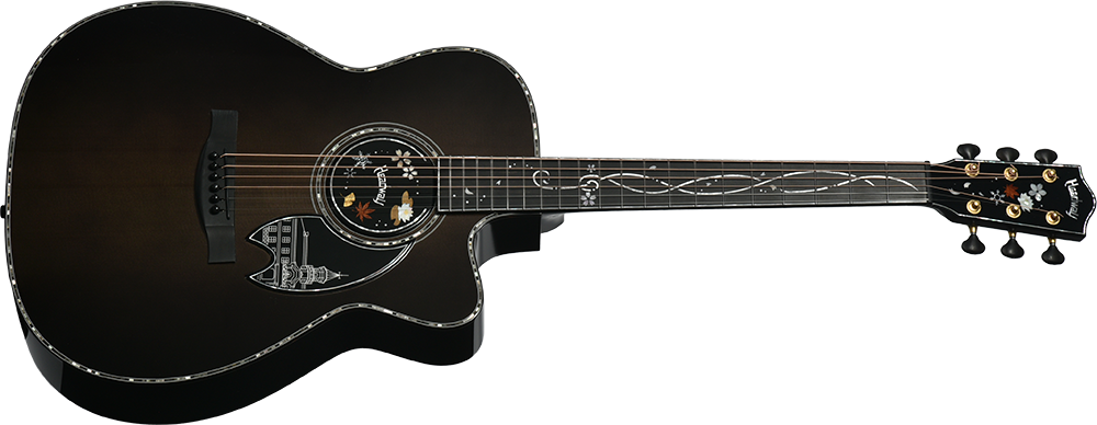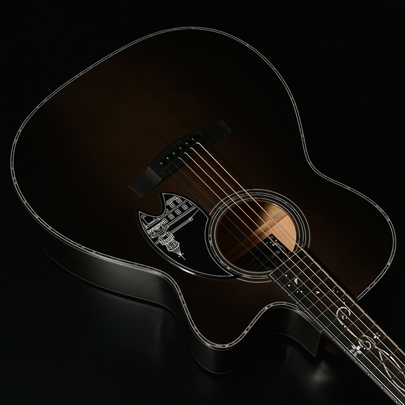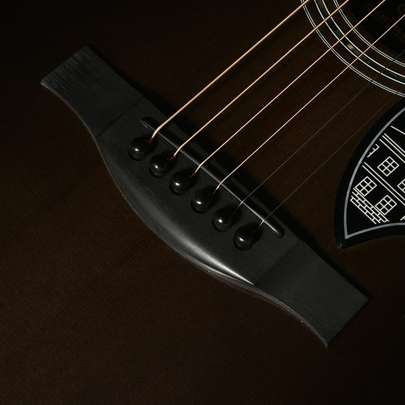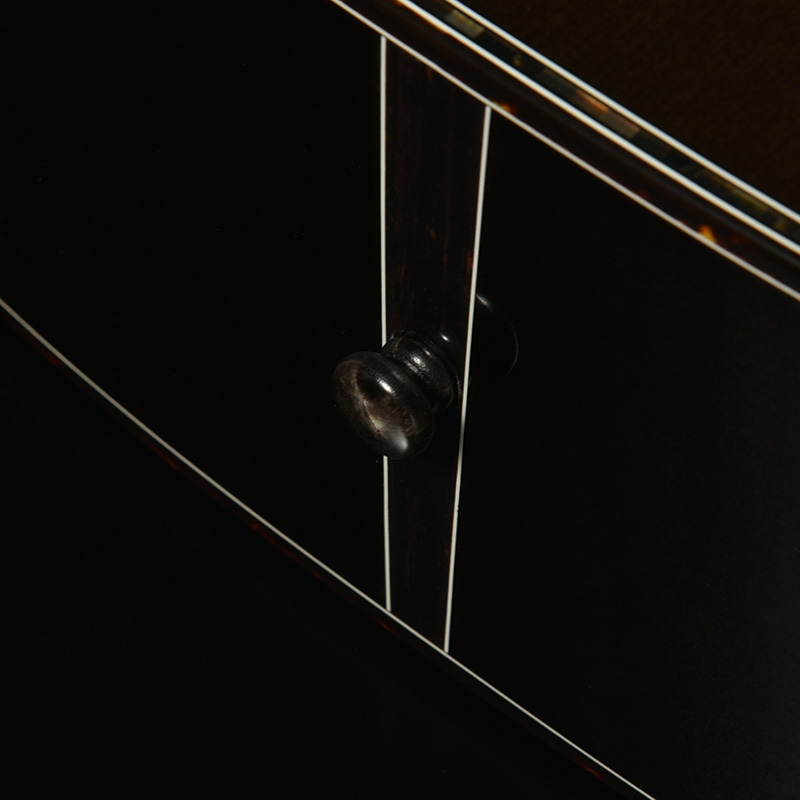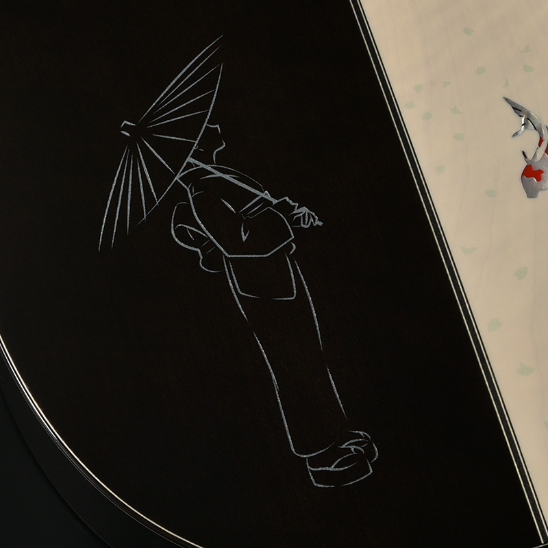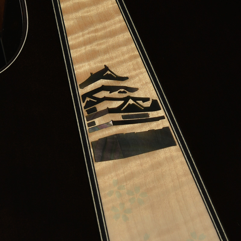 ボディのカラーリングは松本城の天守をイメージした”黒”で仕上げました。桜材の杢目を見せる黒の色合いは表現が難しく、数々のギターを塗り分けてきた職人の技と感覚で調色されています。