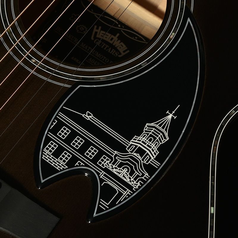 国宝にも指定され、日本で最も古い学校の一つとして知られる松本市の「旧開智学校校舎」をピックガードにデザイン。