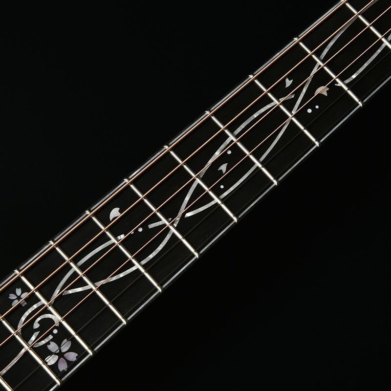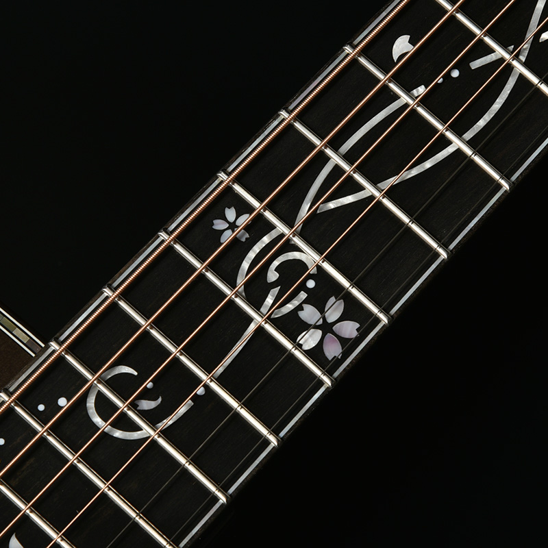 「桜ギター」の一番の特色であるボディサイド・バックの桜材は、私たちが”桜サウンド”と表現する、中音域に特徴のある音色を聞かせます。さらに白い漆喰の壁をイメージし、ボディバックセンターのカラーリングには特別に調色したホワイトグラデーションを採用しています。