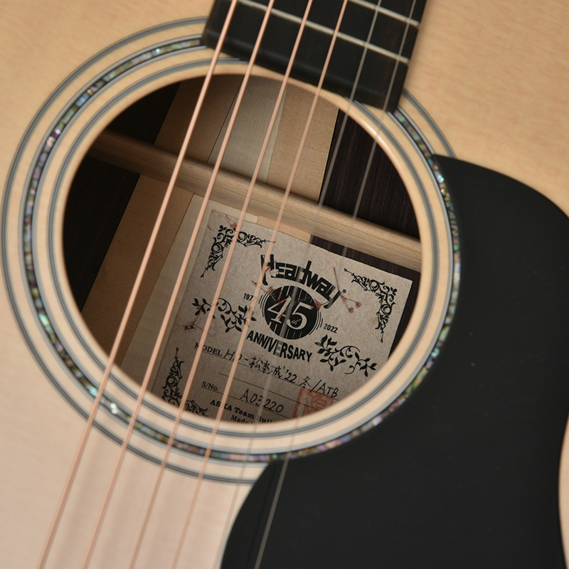 Headwayマスタービルダー百瀬恭夫の近年の製作実績から最も手応えを感じたブレーシングレイアウト「34 Semi Forward Shifted, Scalloped X Bracing」を採用。フォワードシフトよりもXブレーシングの交差位置を「4.6mm」ほどブリッジ側に寄せたいわゆる「セミフォーワードシフト」に近いレイアウトで、繊細なタッチでも反応する柔らかい倍音を持ち、芯のある力強いサウンドに仕上がりました。また、ブリッジに近いブレーシングレイアウトのため強度面でも安定している点も大きな魅力です。
