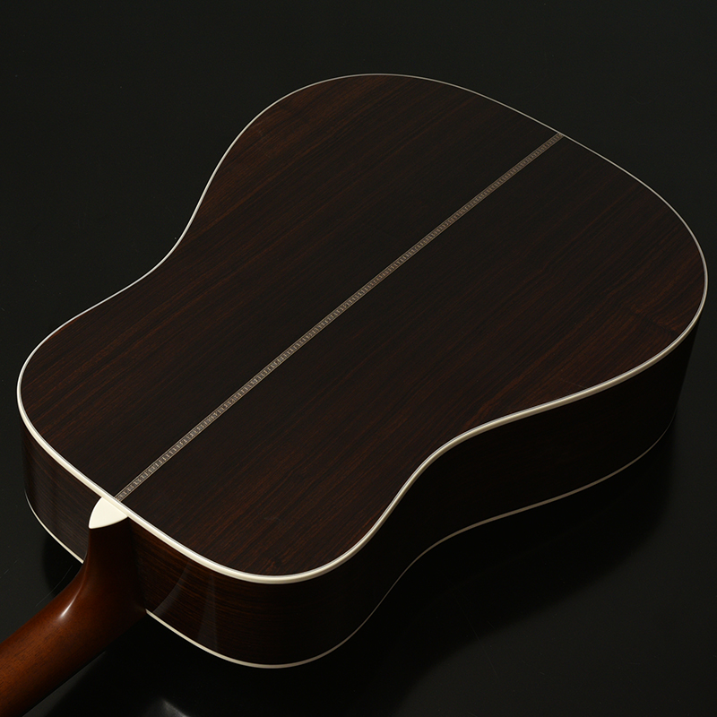 ボディーとネックの接合部であるネックブロックもサイズダウンし軽量化を計りました。指板とブリッジも合わせて薄く加工しています。通常のローズウッドサイドバックのHD-115は平均約2.2kg前後の重量ですが、この新設計の「Featherシリーズ」の重量は1.9~2.0kgと約1割減の200gほどの軽量化を実現しました。実際に手に取って比較するとこの200gの違いは大きく、演奏時や運搬時のストレスが大幅に減少すると体感して頂けると思います。設計の変更に従ってサウンドのボイシングにも調整を加え、迫力ある中低音と伸びやかな高音を実現しています。是非新しいFeatherシリーズを手に取って弾いてみてください。