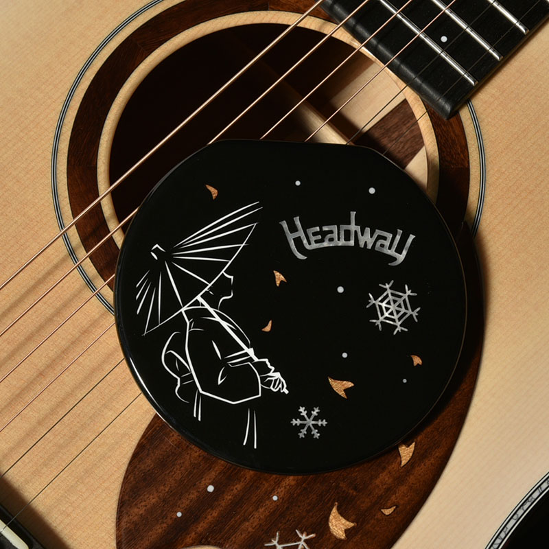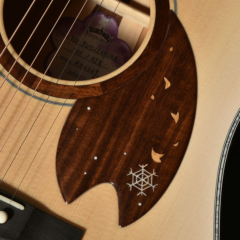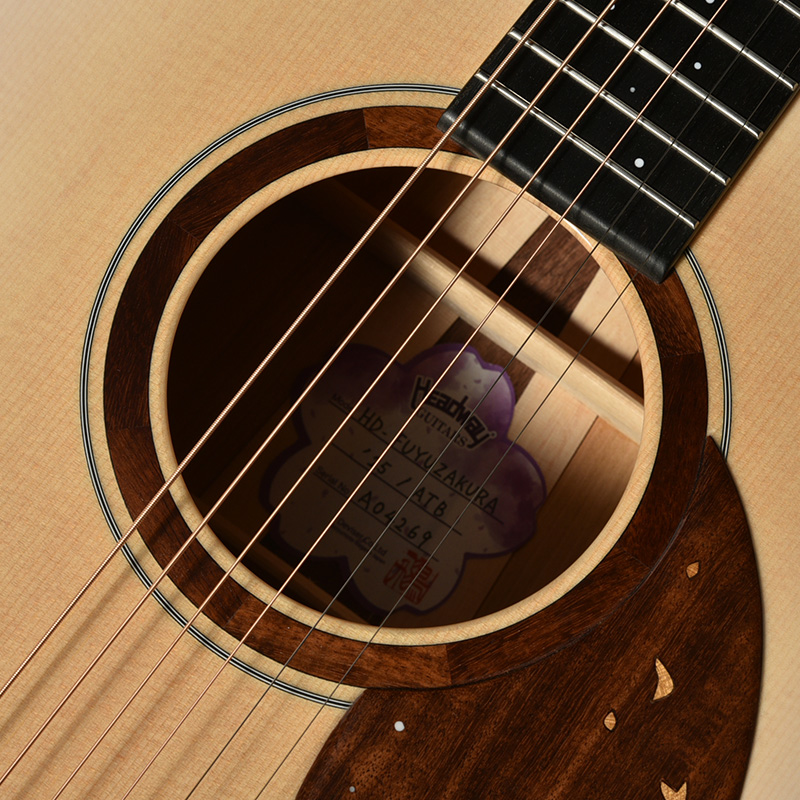 サウンドホールカバーには、桜材と“舞い降る雪”を組み合わせたデザイン中に、和傘の女性を細やかに描き込んでいます。