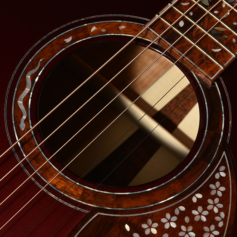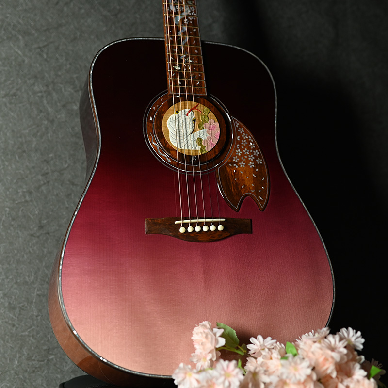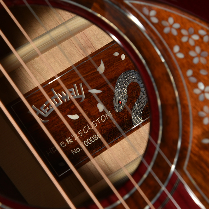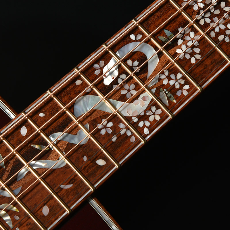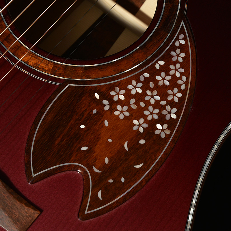 限定モデルの代名詞ともなったサウンドホールカバーにも、軽井沢彫りによる「蛇」と「桜」を彫刻。同じく軽井沢で木彫工芸品の技を継承する「クラサワ工房」の手による彩色が行われており、伝統技術ならではの深みのある色合いと質感が魅力となっています。