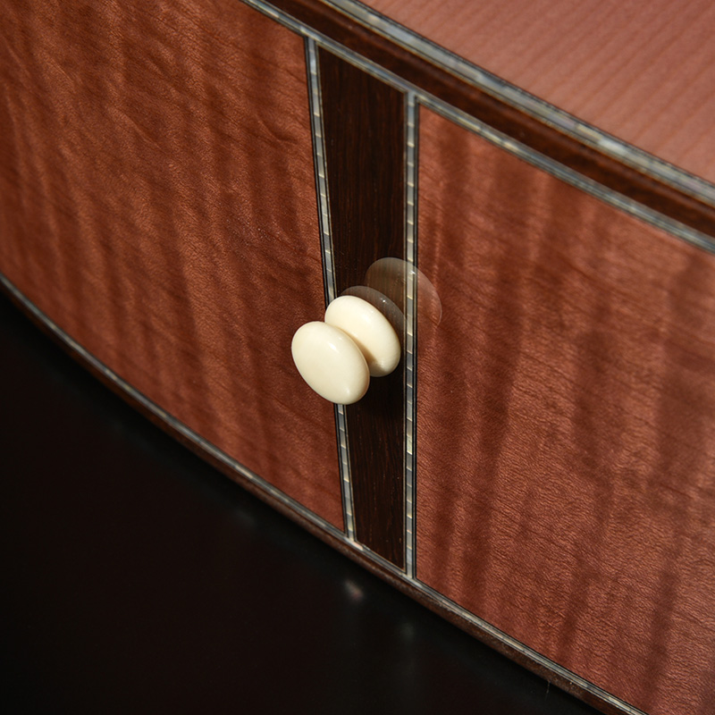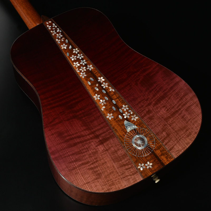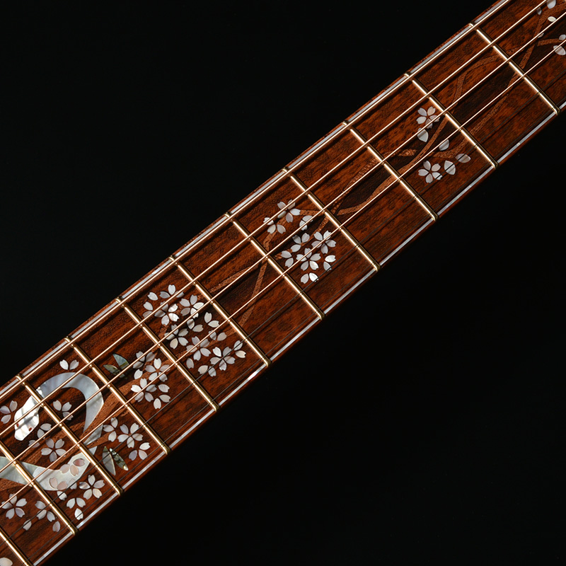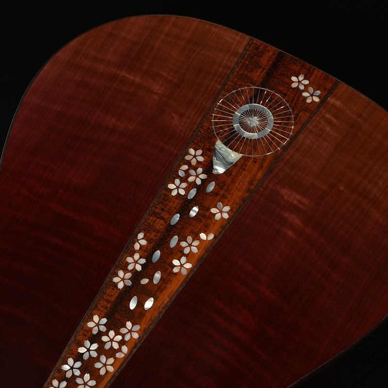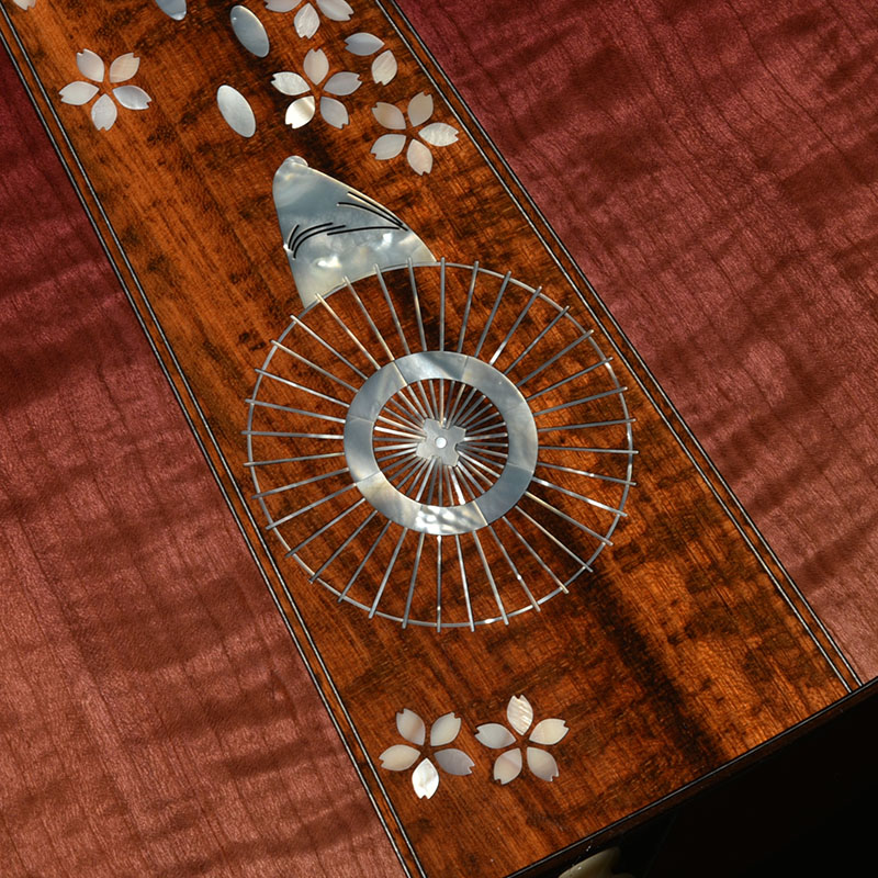 山桜には目の詰まった美しい杢の最高級材を使用し、二つの素材が織りなす音色はまさに唯一無二。ボディバックには、桜吹雪の中を歩む和傘の女性の後ろ姿を白蝶貝でインレイし、静謐さと華やかさを併せ持つ和の美を表現しました。