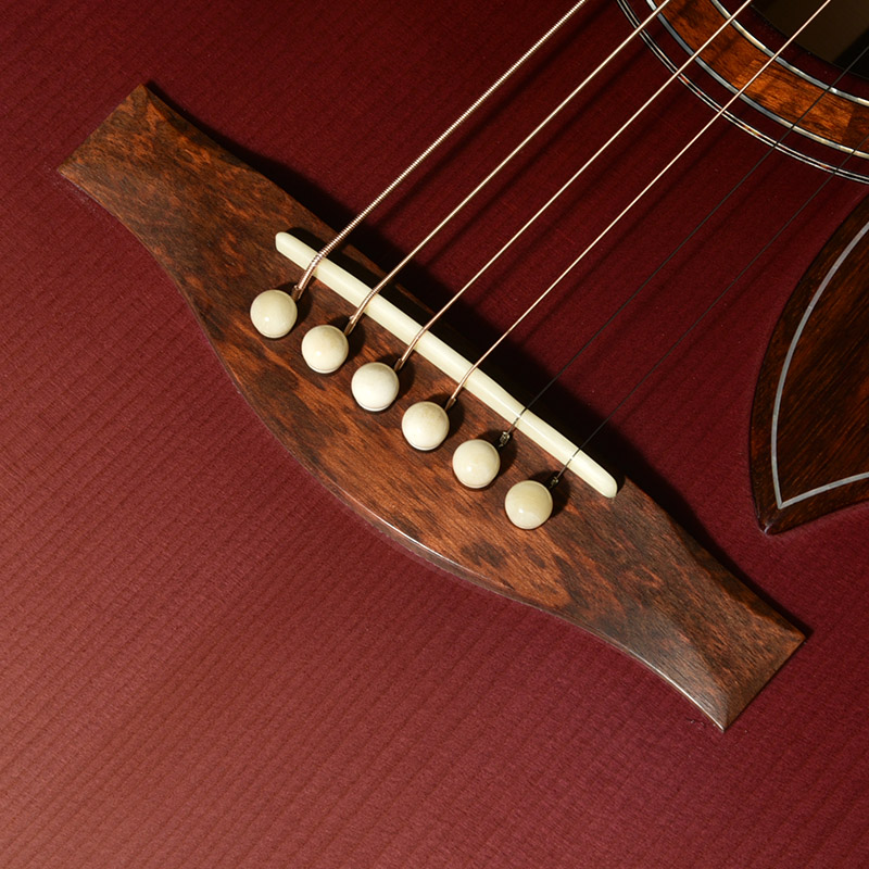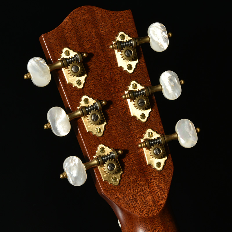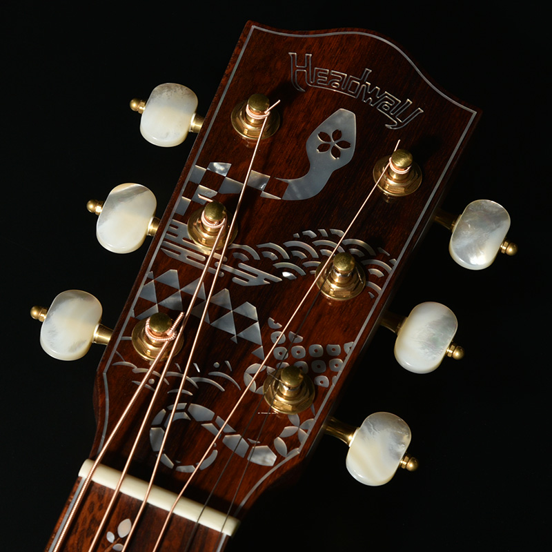 そのスネークウッドをボディバックのセンターピースだけでなく、指板や口輪、ピックガードに至るまで、各所に贅沢に使用しました。