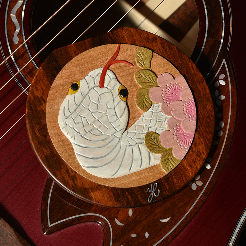 「蛇」と「桜」が彫刻されたサウンドホールカバー
