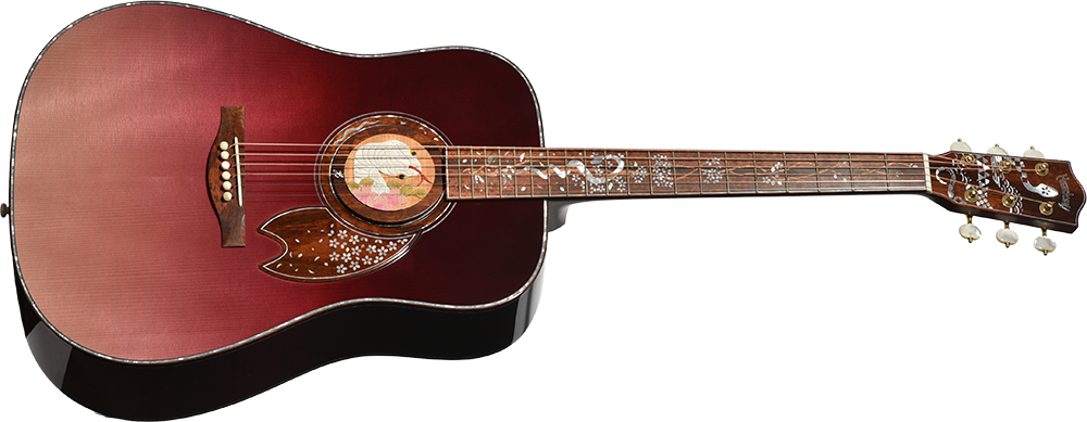 2025年の干支である巳(蛇)と、Headwayの十八番である桜のモチーフを融合させたデザインが華やかな、まさにショーモデルの名にふさわしい豪華絢爛な1本。桜舞う道を歩む「和傘の女性」や、古来より縁起物として珍重されてきた白蛇など、素材から着想を得たモチーフをギター各所にあしらい、唯一無二の世界観を表現しました。