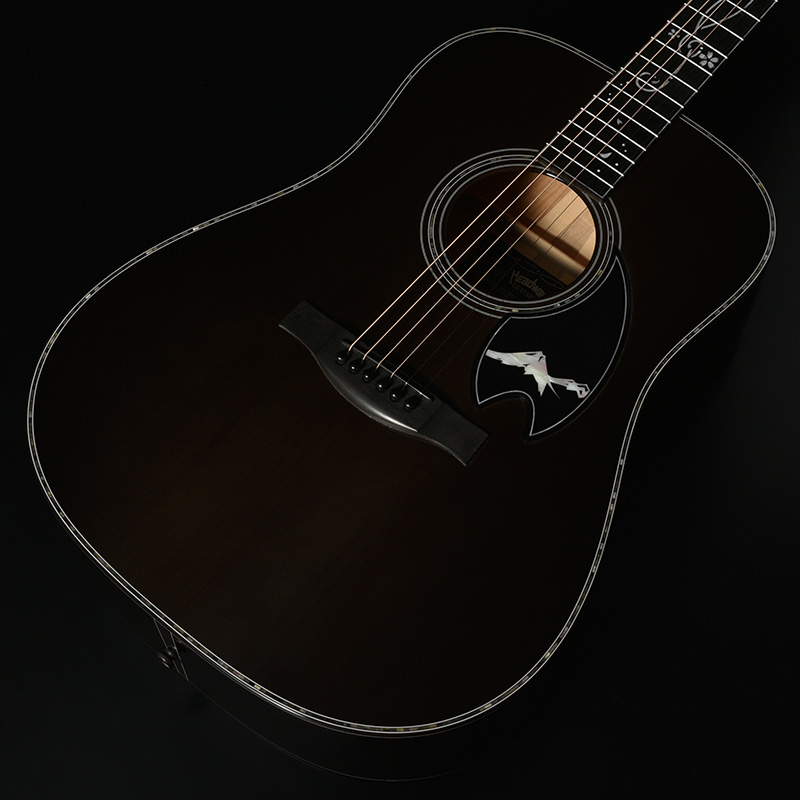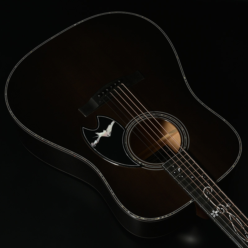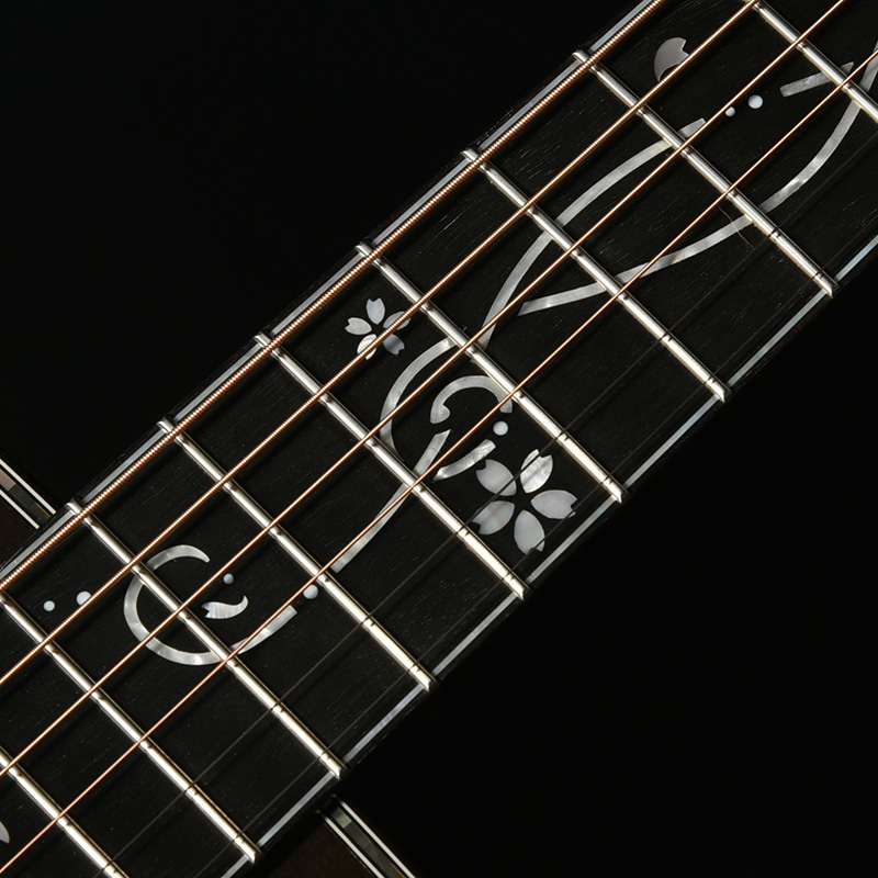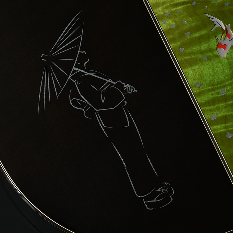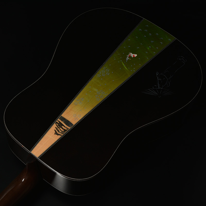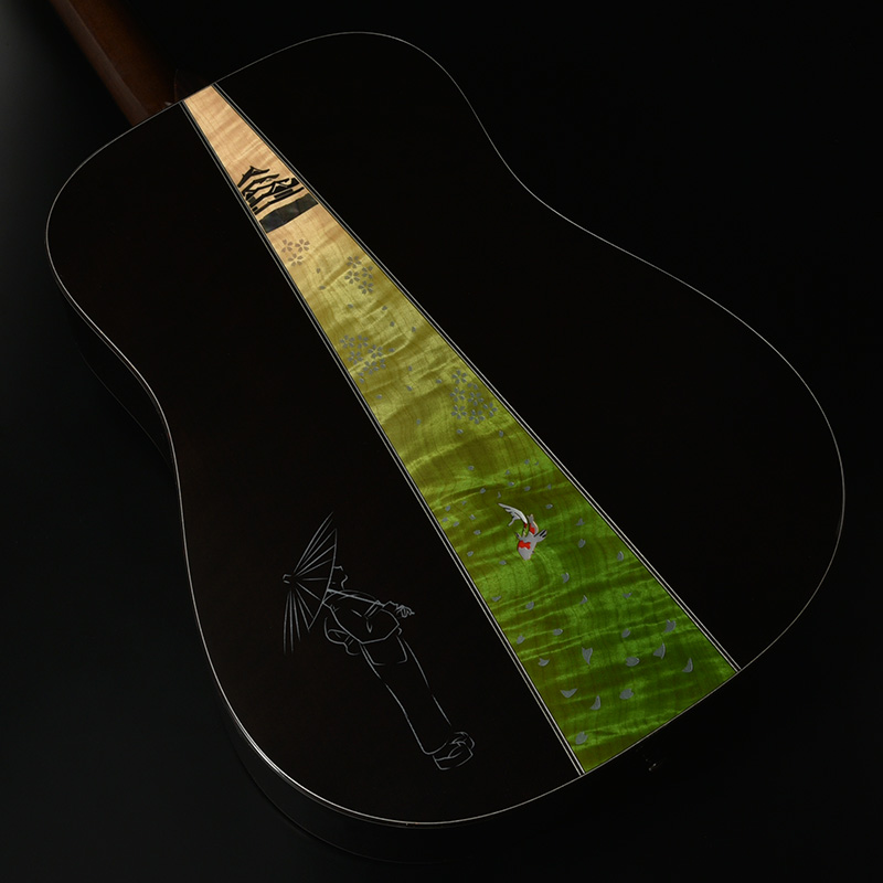 「桜ギター」の一番の特色であるボディサイド・バックの桜材は、私たちが”桜サウンド”と表現する、中音域に特徴のある音色を聞かせます。さらにボディバックセンターでは新緑に包まれた夏山をイメージした鮮やかなグリーンを配色し、季節の移ろいを表現しています。