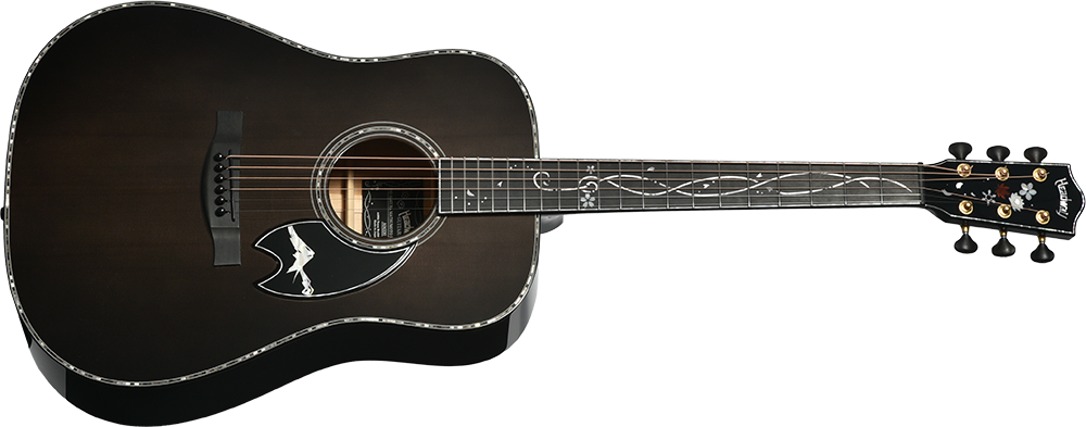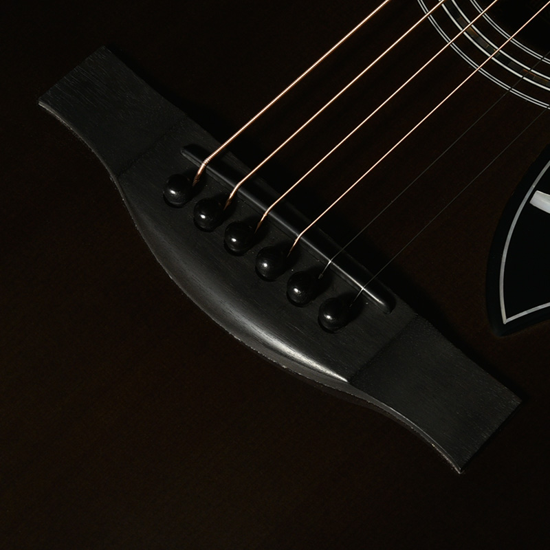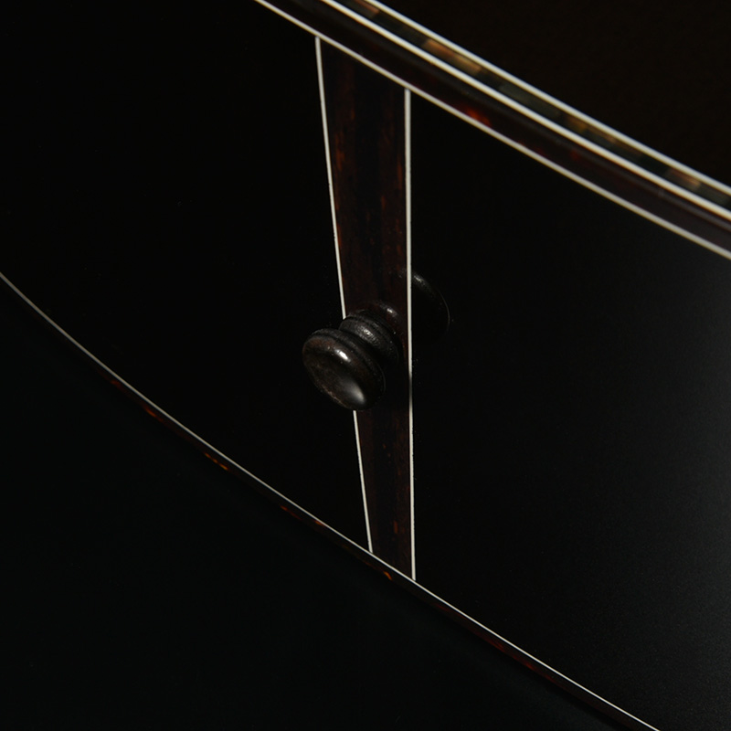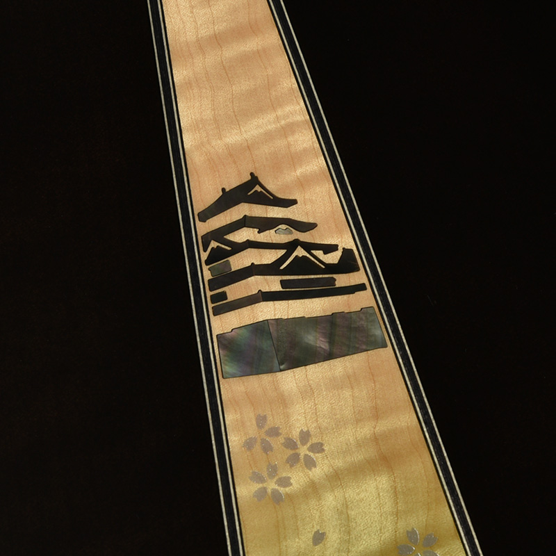 ボディのカラーリングは松本城の天守をイメージした”黒”で仕上げました。桜材の杢目を見せる黒の色合いは表現が難しく、数々のギターを塗り分けてきた職人の技と感覚で調色されています。