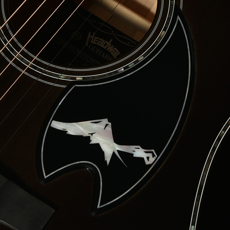 3個のガク「学」「楽」「岳」からなる、松本市の三ガク都からギターへ繋がりのある「楽」をト音記号として指板にデザインし表現しています。