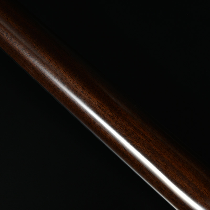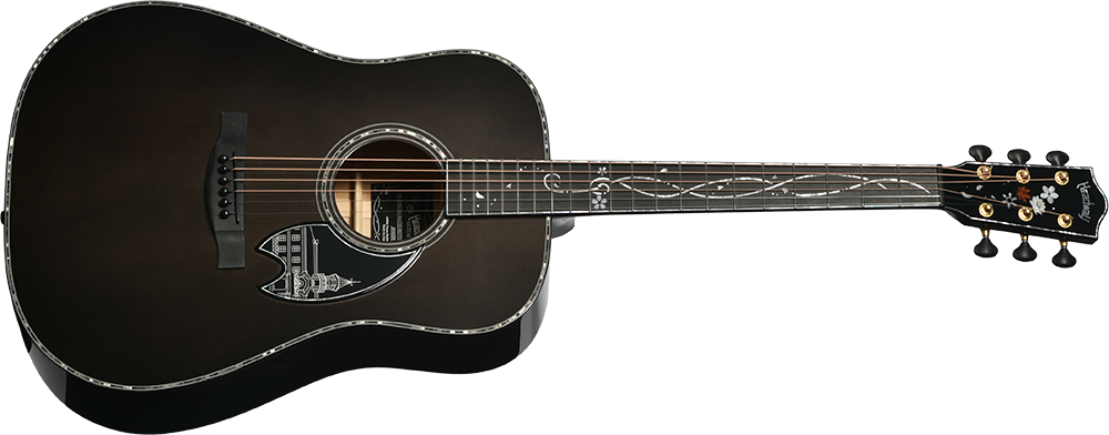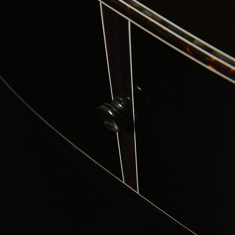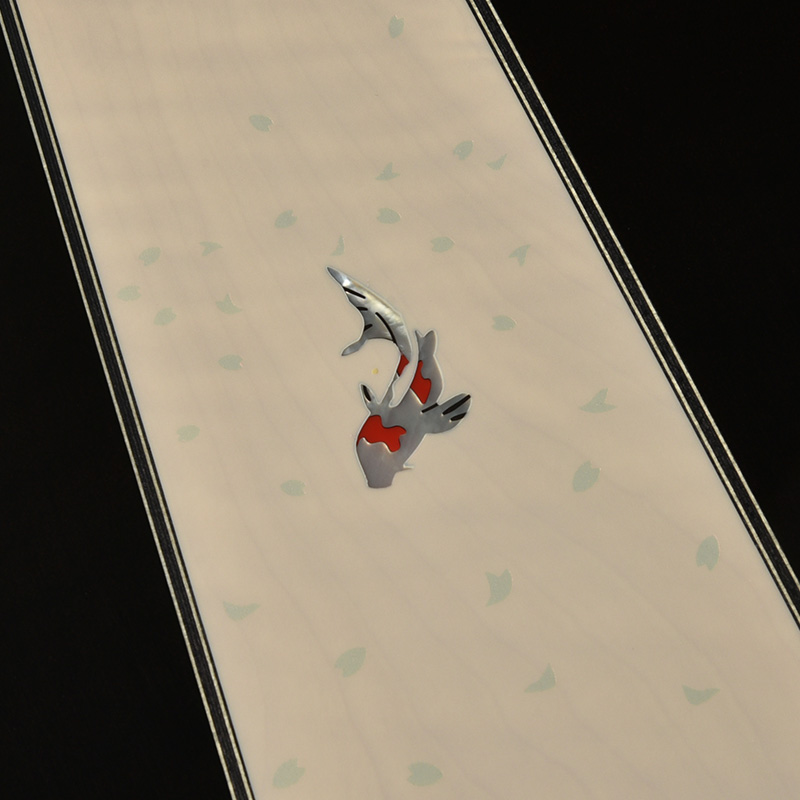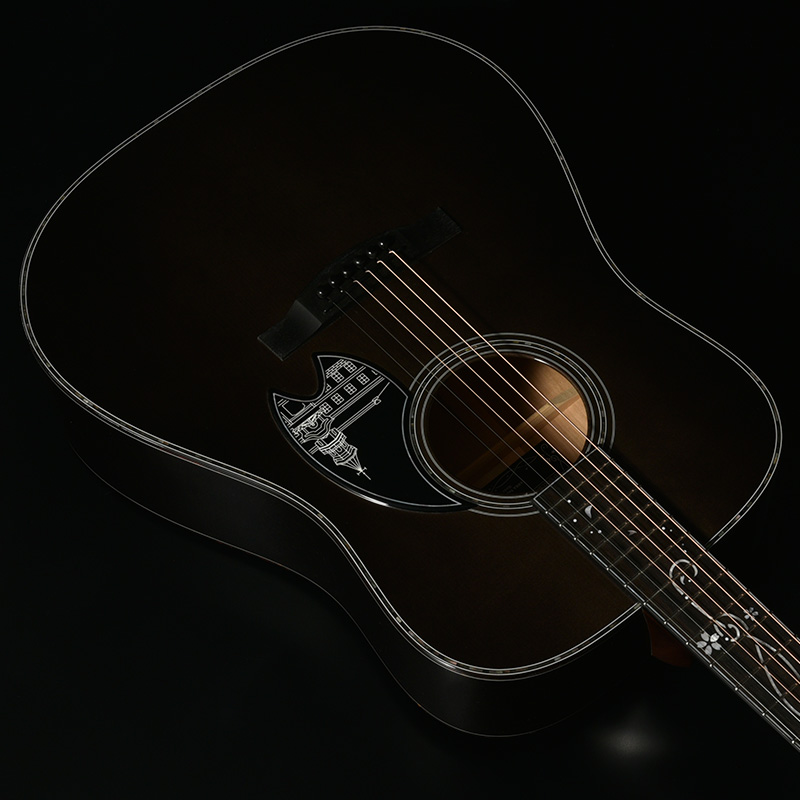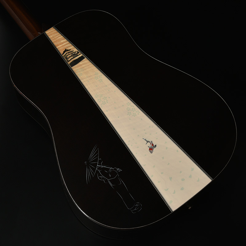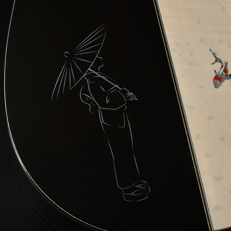 ボディのカラーリングは松本城の天守をイメージした”黒”で仕上げました。桜材の杢目を見せる黒の色合いは表現が難しく、数々のギターを塗り分けてきた職人の技と感覚で調色されています。