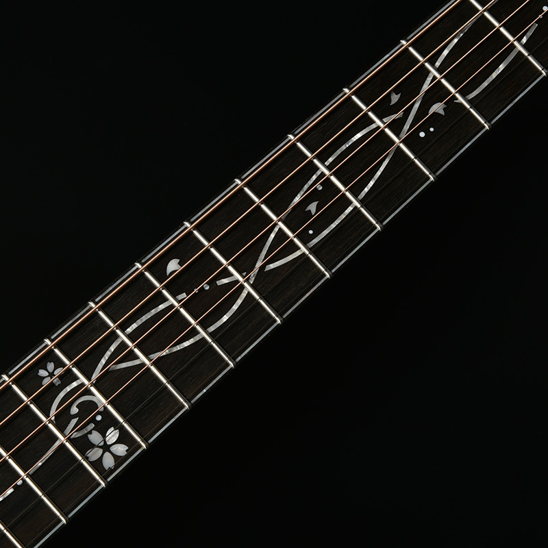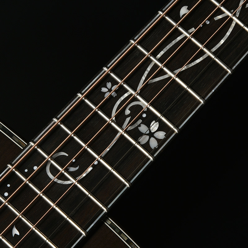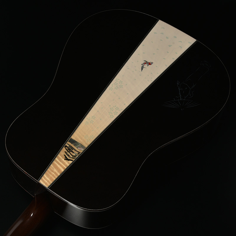 「桜ギター」の一番の特色であるボディサイド・バックの桜材は、私たちが”桜サウンド”と表現する、中音域に特徴のある音色を聞かせます。さらに白い漆喰の壁をイメージし、ボディバックセンターのカラーリングには特別に調色したホワイトグラデーションを採用しています。