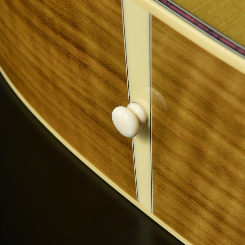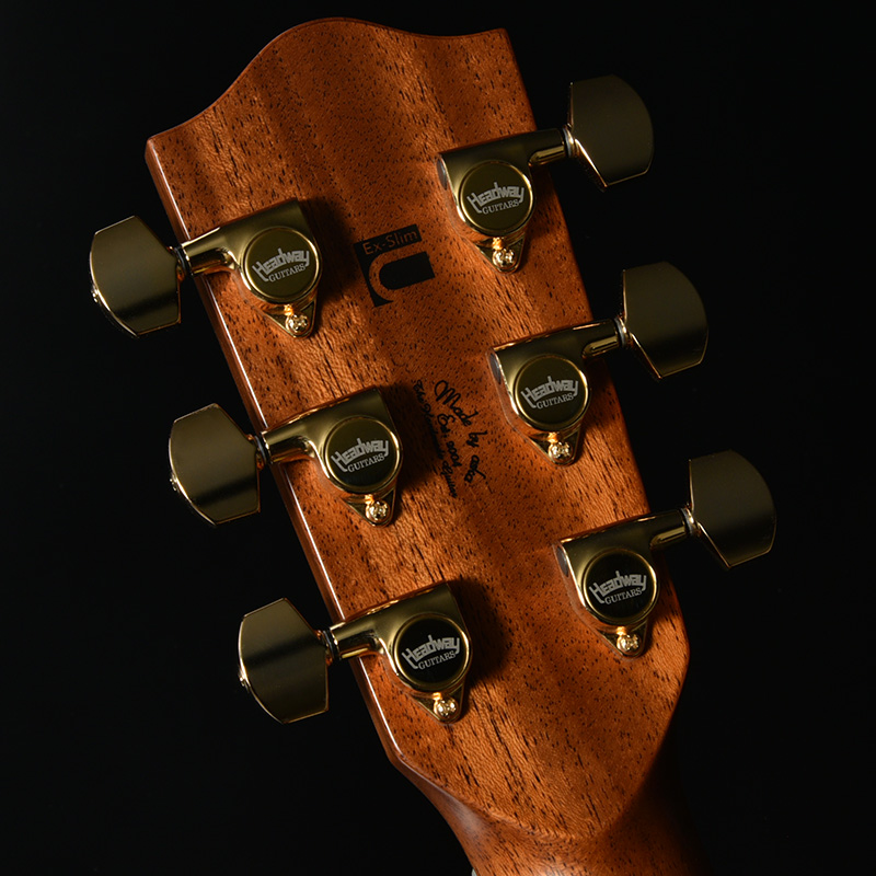 従来のHeadwayのネックのイメージを覆す薄さを重視した『Extra Slim U Neck』を採用。Headwayネックの特徴である安定性はもちろん考慮され、カーボンバーを入れる「ハイストレングネック」仕様によって剛性を高めています。カーボンバーの効果は安定性のみでなく、不要なネックのしなりを抑え弦の振動がスムーズにボディトップに伝わることにより、高音域の表現力が向上しています。