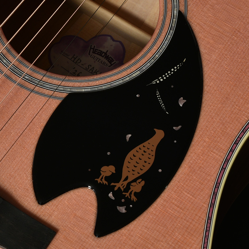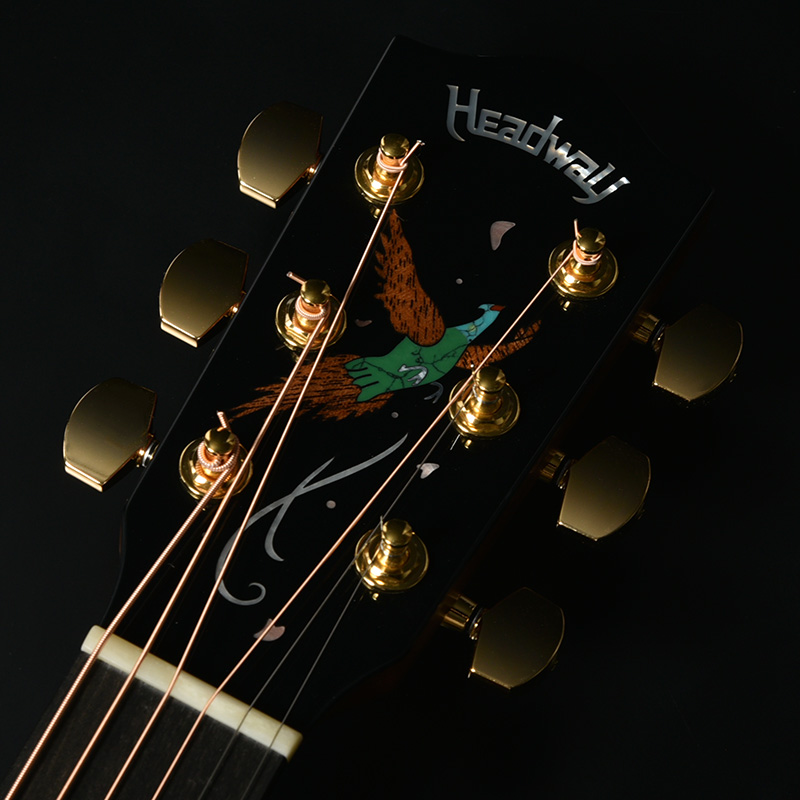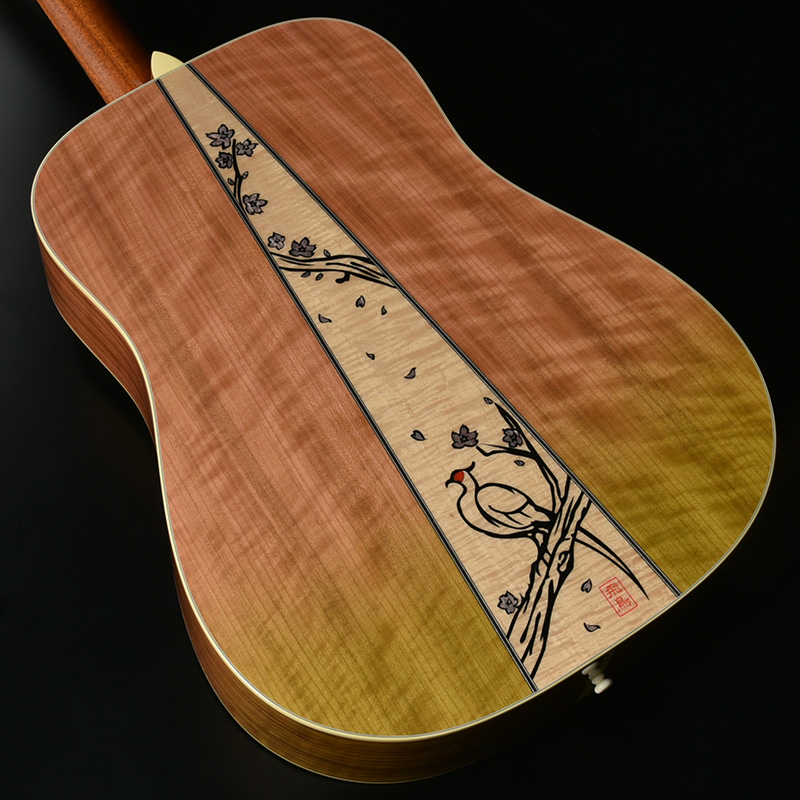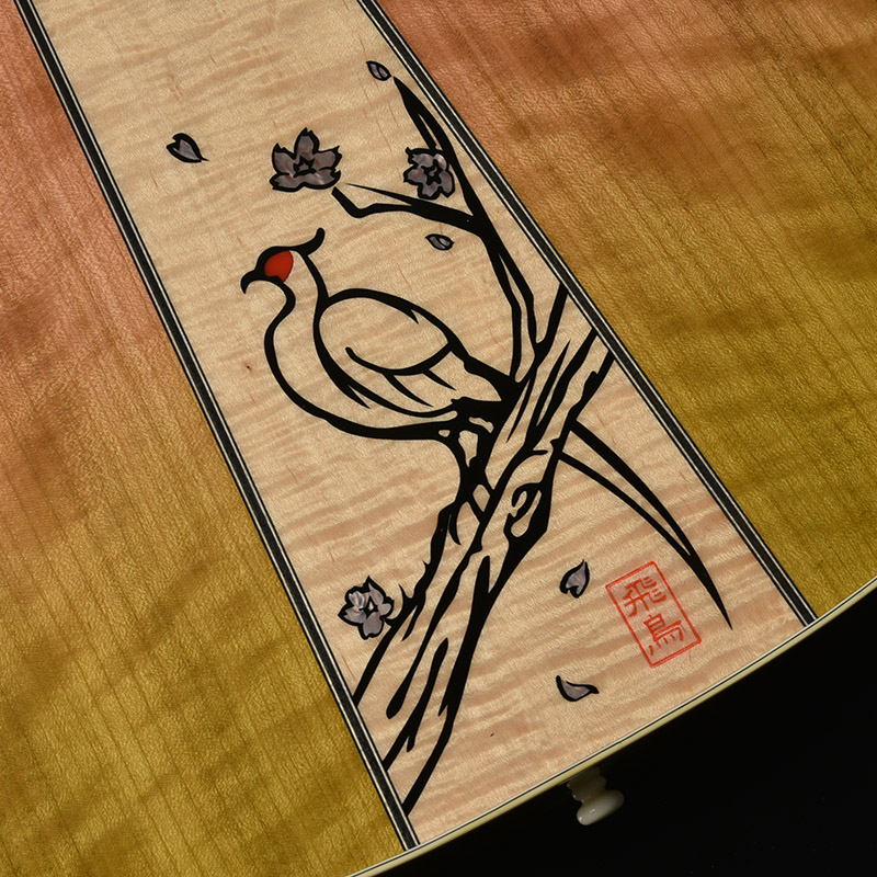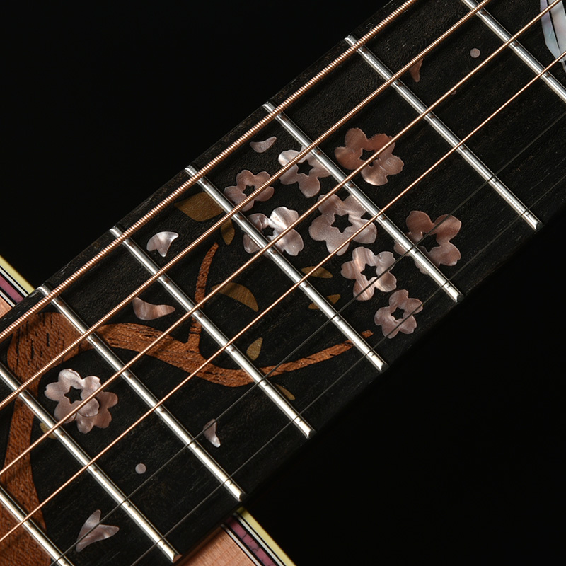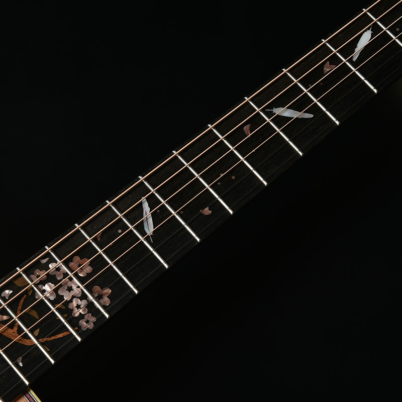 エボニー材の指板にて、インレイワークで桜の花とキジの羽がデザインされています。キジのテーマに合わせた和のテイストを目指し、天然貝や木材など複数の素材を使い分け製作しました。美しい桜の幹と花びら、そして舞い落ちるキジの羽を表現しています。