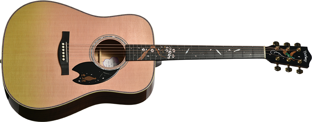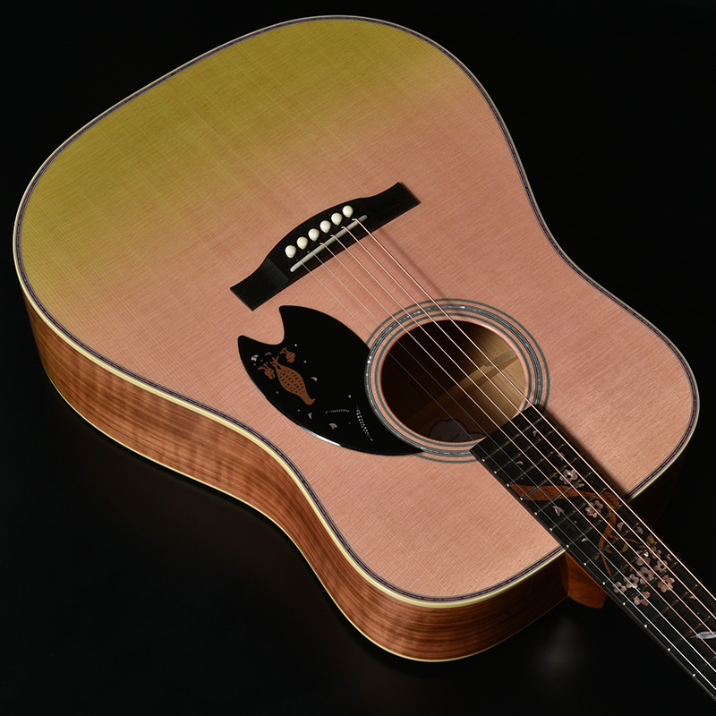カラーリングは桜の杢目を引き立てる淡い桜色と春の芽吹きを感じる若草色をグラデーションで表現しています。異なる2色を組み合わせることは繊細な塗装の塗り分けと重なり合う部分の色の表現がキーポイントとなる為、数多の桜ギターを塗り分けてきた塗装職人の技が光るカラーリングです。