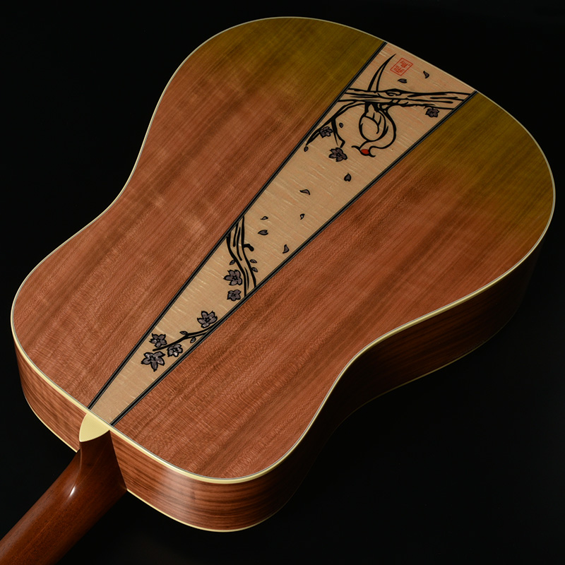 ボディバックのセンターは墨で描かれた掛け軸をイメージしております。単に塗装で墨絵風に表現するだけに留まらず、桜の花にはインレイを埋め込むなど複数の技法を組み合わせることで生まれた奥深さがあります。ファクトリーの「飛鳥」も押印されており、これは職人が1本1本手作業で押印している為、僅かな個体差が手に取った1本だけの特別感を演出します。