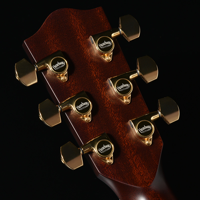 Headwayマスタービルダーの百瀬恭夫が1934年製のビンテージギターのブレーシングを研究し、独自に発展させたブレーシングを継承。Xのクロス位置がサウンドホールに近いセミフォワードシフトで新品時より低音の反応がよく、ボリュームのある鳴りを持ちます。フォワードシフトよりも5mmほどブリッジ寄りになっていることにより、トップ板の安定性も考慮された設計が行われています。