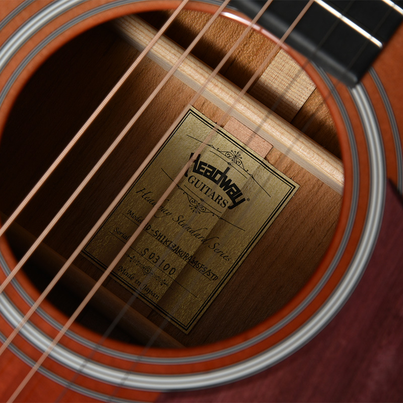 Headwayマスタービルダーの百瀬恭夫が1934年製のビンテージギターのブレーシングを研究し、独自に発展させたブレーシングを継承。Xのクロス位置がサウンドホールに近いセミフォワードシフトで新品時より低音の反応がよく、ボリュームのある鳴りを持ちます。フォワードシフトよりも5mmほどブリッジ寄りになっていることにより、トップ板の安定性も考慮された設計が行われています。