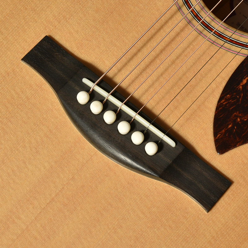 Headwayマスタービルダーの百瀬恭夫が1934年製のビンテージギターのブレーシングを研究し、独自に発展させたブレーシングを継承。Xのクロス位置がサウンドホールに近いセミフォワードシフトで新品時より低音の反応がよく、ボリュームのある鳴りを持ちます。フォワードシフトよりも5mmほどブリッジ寄りになっていることにより、トップ板の安定性も考慮された設計が行われています。