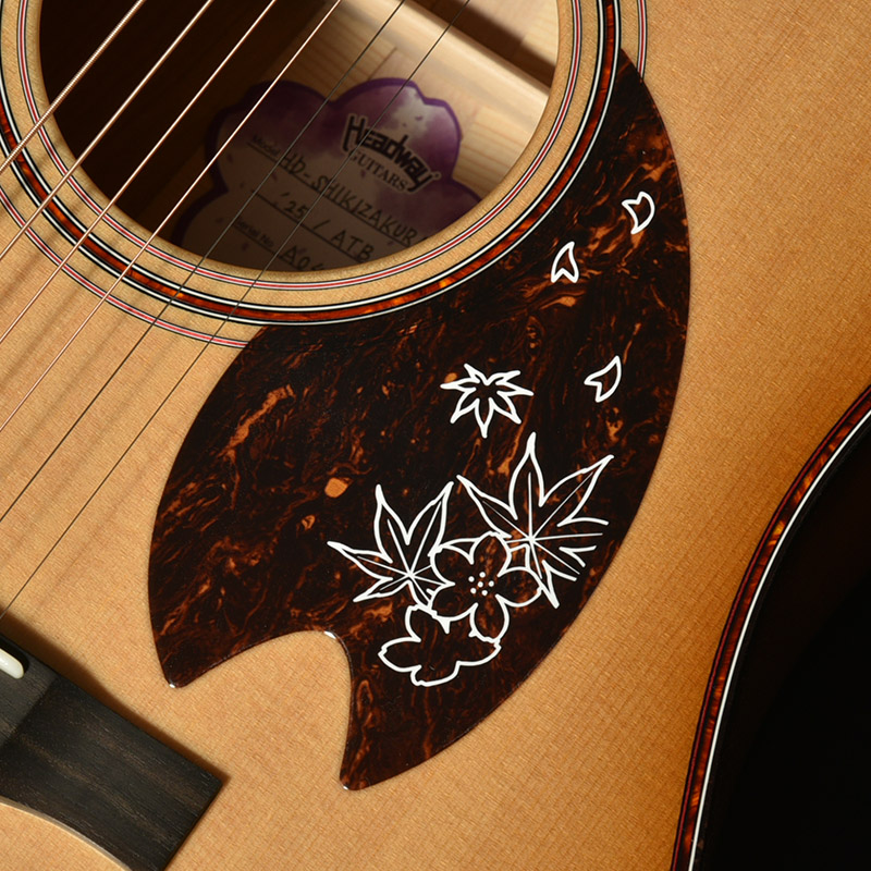 桜の花びらを模したピックガードには秋へと移ろう色彩を表現するためにべっ甲素材を使用し、その上に紅葉と桜が共存するデザインを施しました。サウンドホールカバーには桜ギターの象徴とも言える和傘の女性を描き、舞い散る紅葉の中に佇む情景を表現しています。