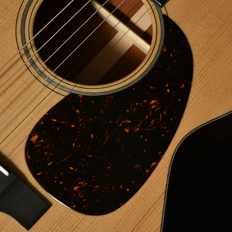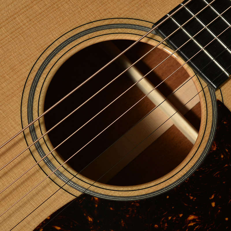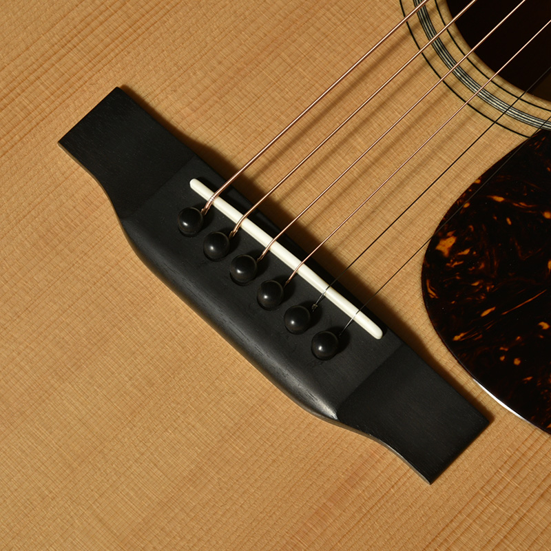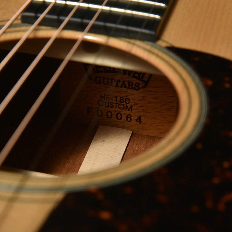 トップにはアディロンダックスプルース、サイド&バックとネックにはホンジュラスマホガニー1ピース、指板・ブリッジにはエボニーを採用。いずれもカスタム用に選んだ確かな材です。HFでは、ブレイシングとの相性を考え、硬めでタップトーンの良いアディロンを選定しています。