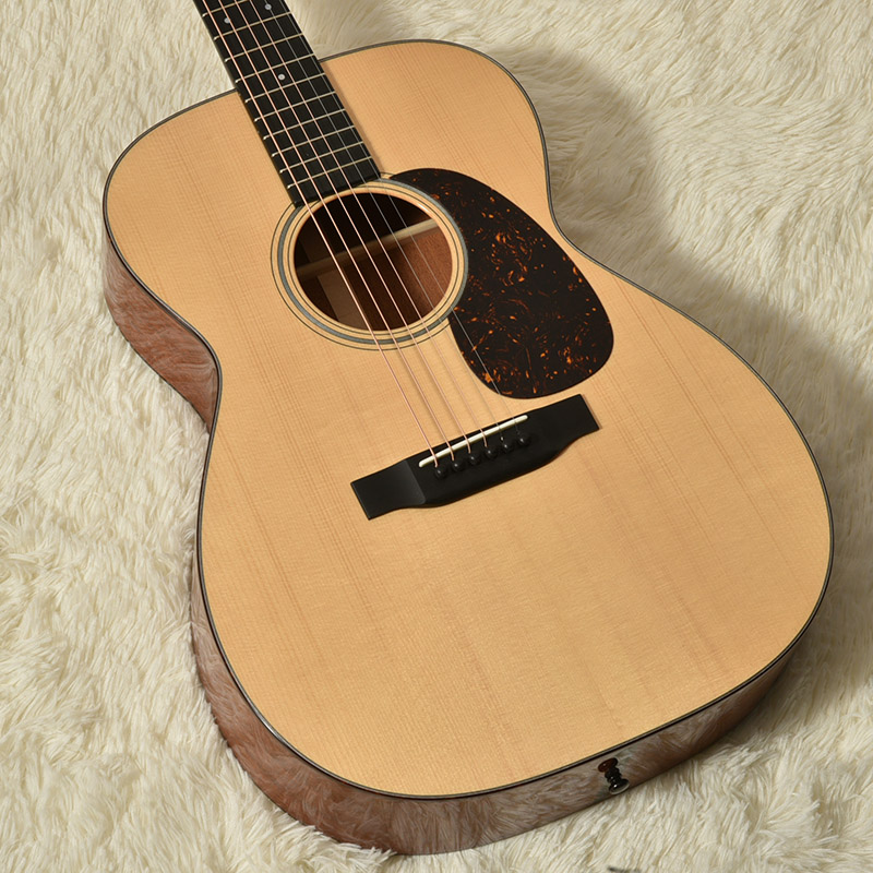 材料構成はトップに「アディロンダックスプルース」サイドバックに「ホンジュラスマホガニー」ネックは「ホンジュラスマホガニー1P」指板とブリッジには「エボニー」を使用しており、どの材もカスタム用に選定したものになります。HFのアディロンダックスプルースは、ブレイシングとの相性を考慮してやや硬めのものの中からタップトーンの伸びの良いものを選んでいます。