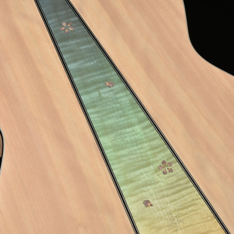 雪と桜を掛け合わせたデザインは、日本の四季の移ろいと自然の美しさを象徴するものです。白い雪と淡いピンクの桜を2種類の材料でつくり、冬の静けさと春の華やかさを同時に表現しながら、指板全体に及ぶツリーオブライフをモチーフとしたインレイデザインでまとめています。