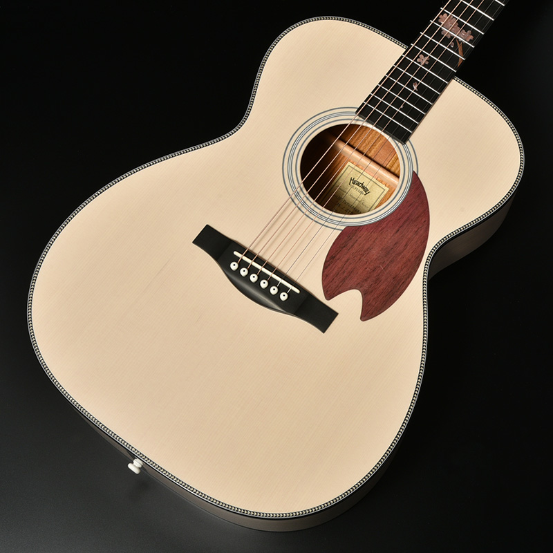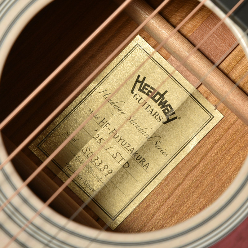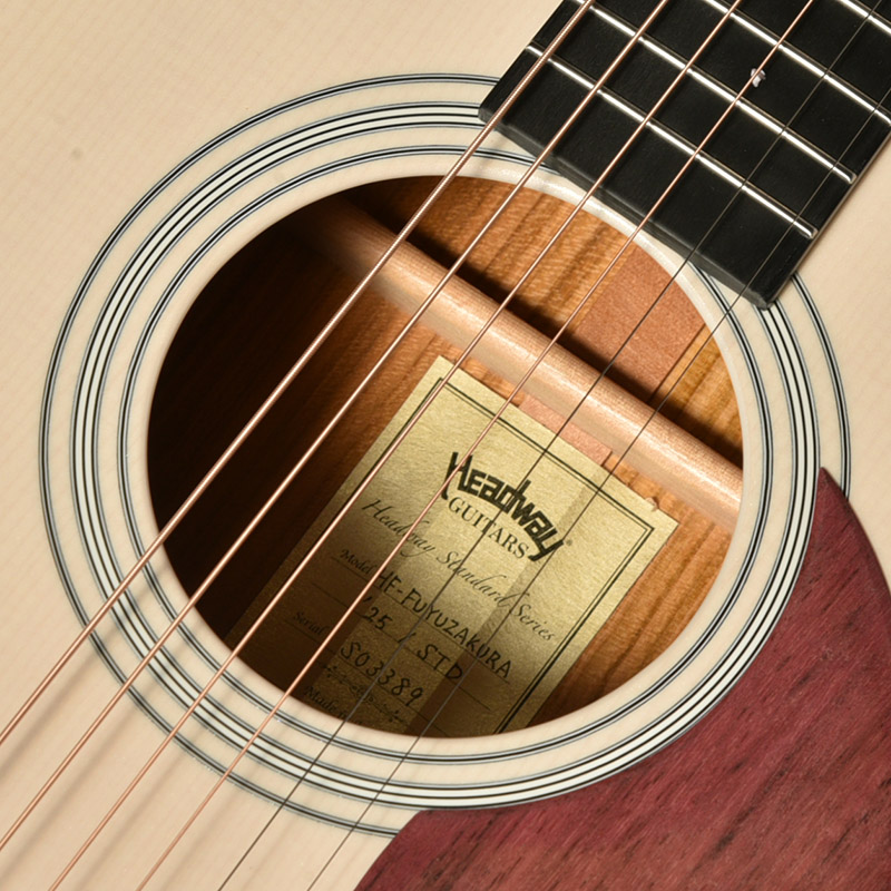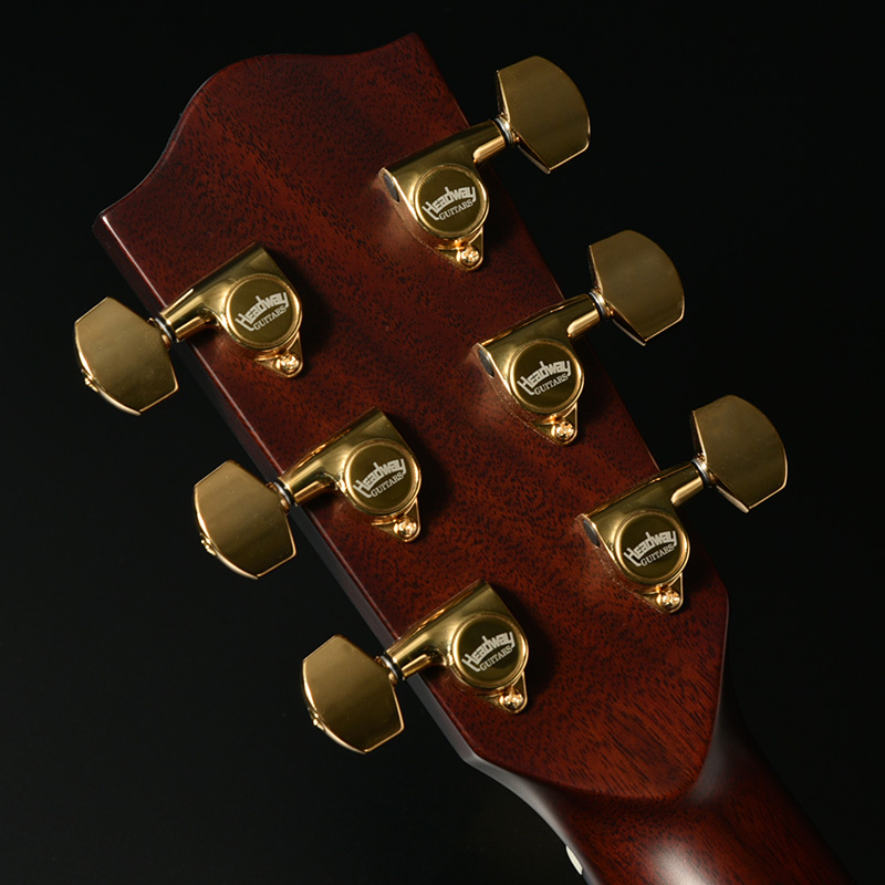 Headwayマスタービルダーの百瀬恭夫が1934年製のビンテージギターのブレーシングを研究し、独自に発展させたブレーシングを継承。Xのクロス位置がサウンドホールに近いセミフォワードシフトで新品時より低音の反応がよく、ボリュームのある鳴りを持ちます。フォワードシフトよりも5mmほどブリッジ寄りになっていることにより、トップ板の安定性も考慮された設計が行われています。