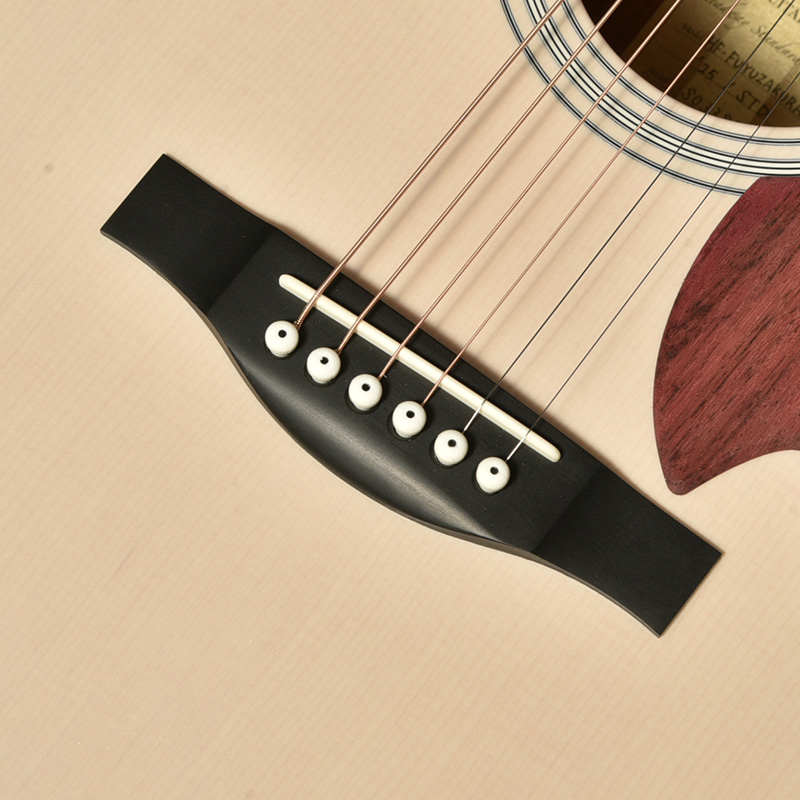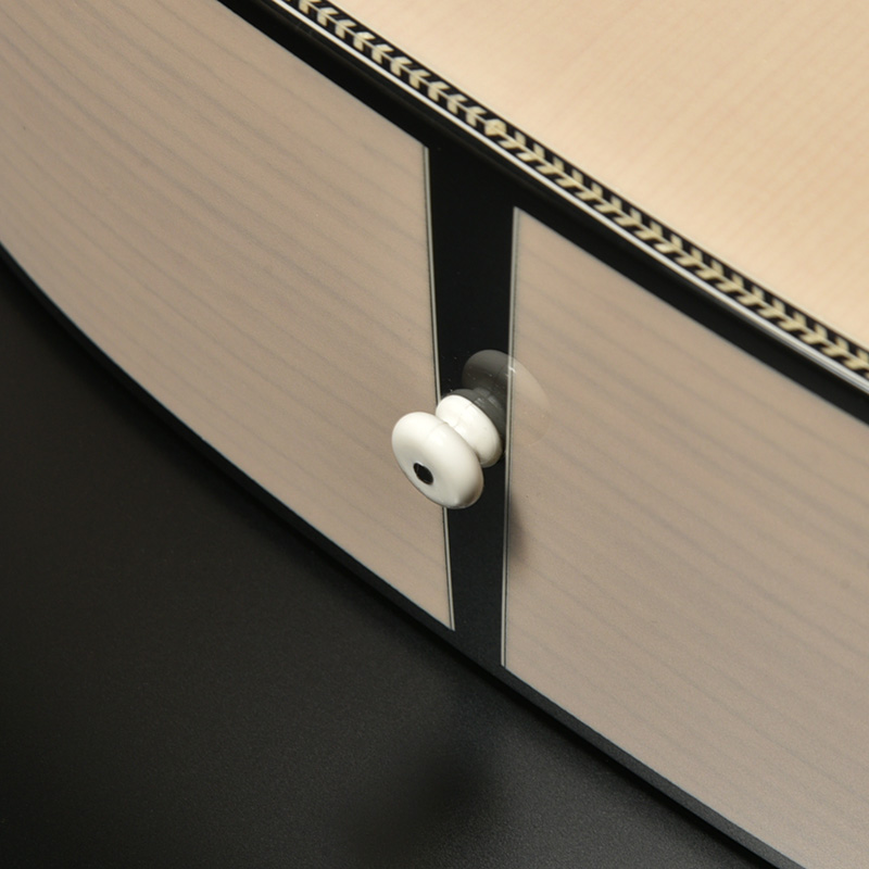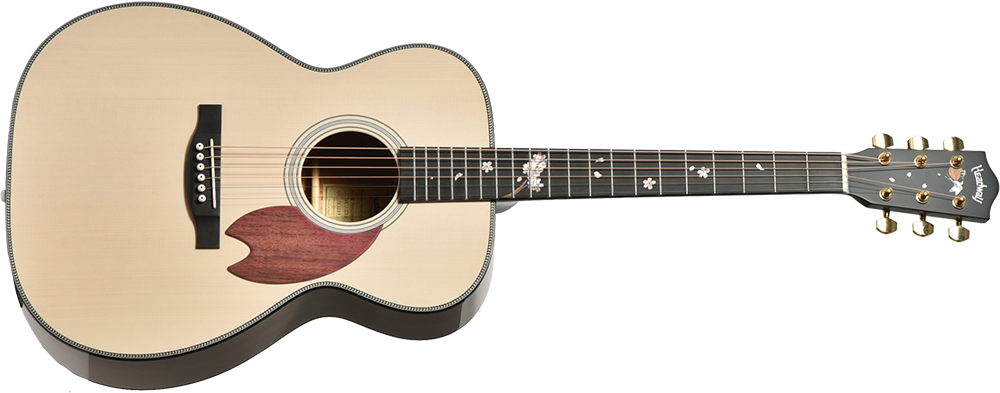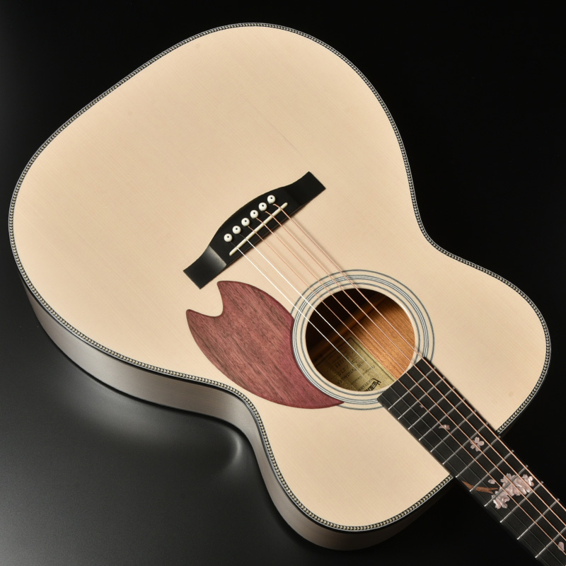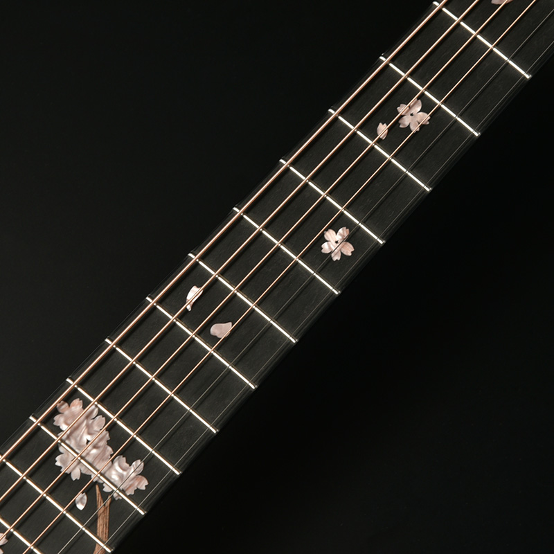 桜の花びらを模ったインレイが指板を美しく彩ります。通常のポジションマークをもつギターから持ち替えても違和感の少ないよう、演奏性にも配慮されたデザインです。