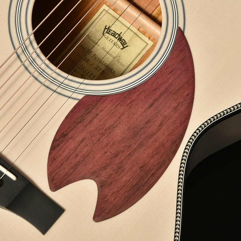 桜ギターを象徴するパープルハート材で作られた桜型のピックガード。最初に作られた一本から変わらない、Headwayの桜ギターである証です。