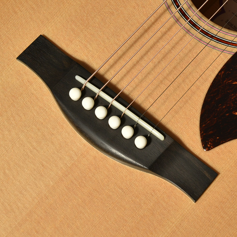 Headwayマスタービルダーの百瀬恭夫が1934年製のビンテージギターのブレーシングを研究し、独自に発展させたブレーシングを継承。Xのクロス位置がサウンドホールに近いセミフォワードシフトで新品時より低音の反応がよく、ボリュームのある鳴りを持ちます。フォワードシフトよりも5mmほどブリッジ寄りになっていることにより、トップ板の安定性も考慮された設計が行われています。