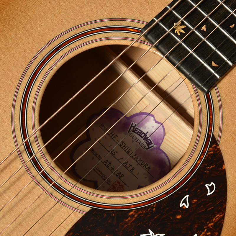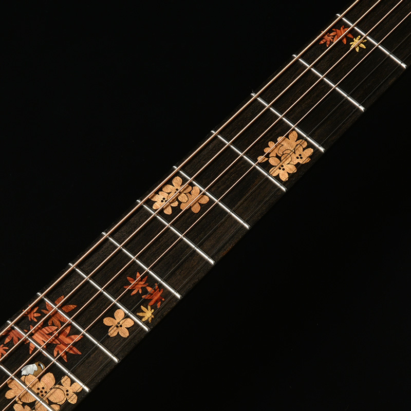 桜の花びらを模したピックガードには秋へと移ろう色彩を表現するためにべっ甲素材を使用し、その上に紅葉と桜が共存するデザインを施しました。サウンドホールカバーには桜ギターの象徴とも言える和傘の女性を描き、舞い散る紅葉の中に佇む情景を表現しています。