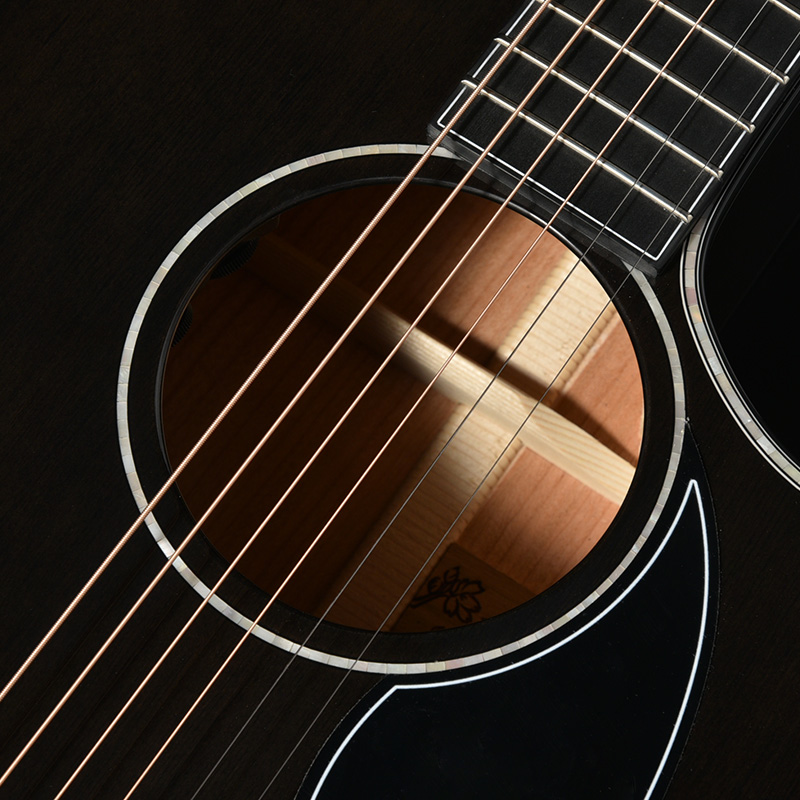 サウンドホール内部、バック材センターの接合部分の割れを予防するため、補強材がバック材のセンターに追加されました。これに伴いサウンドホールプレートの貼り付け位置が変更になっています。