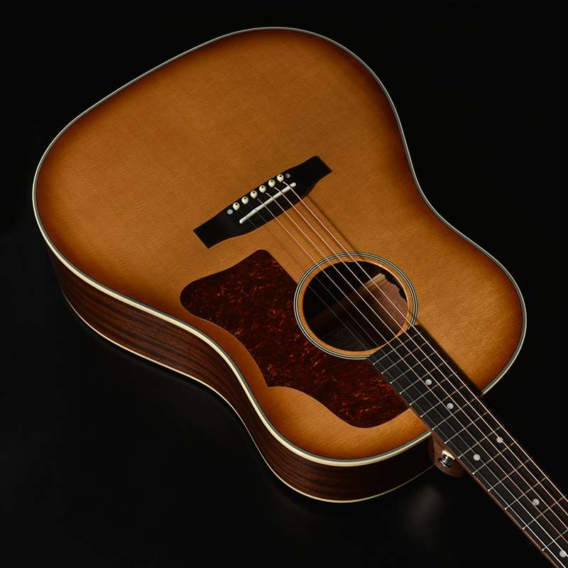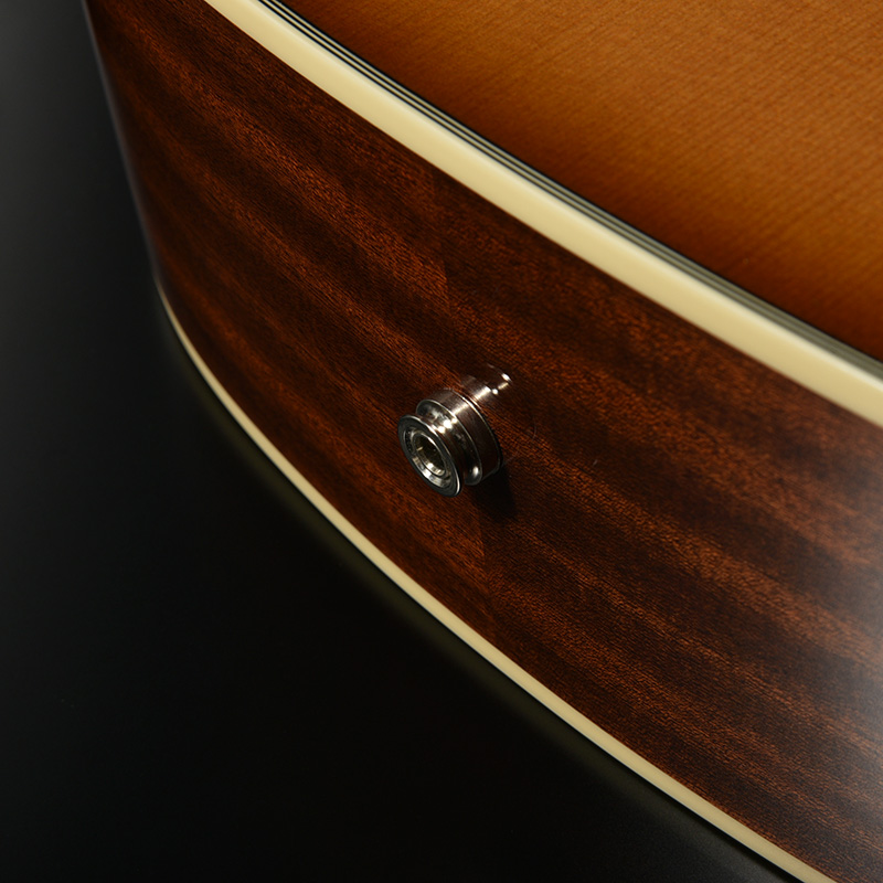 新カラーはその名のとおり、Amber (= 琥珀)のような暖かみのあるブラウンカラーを用いて、経年変化を経て自然に退色したような、落ち着きのあるバーストを施しました。リビングや部屋に置き、日常的に手に取りたくなるギターだからこそ、生活空間に自然に溶け込み、長く愛着を持って弾き続けられる色味への調色を追求しています。
