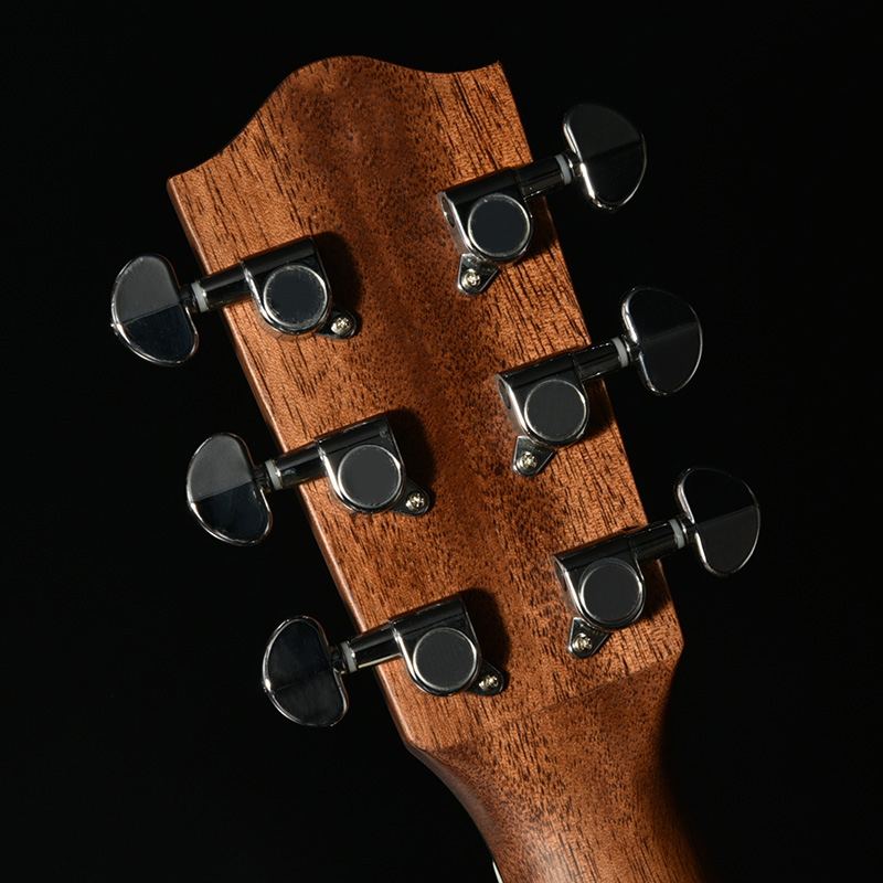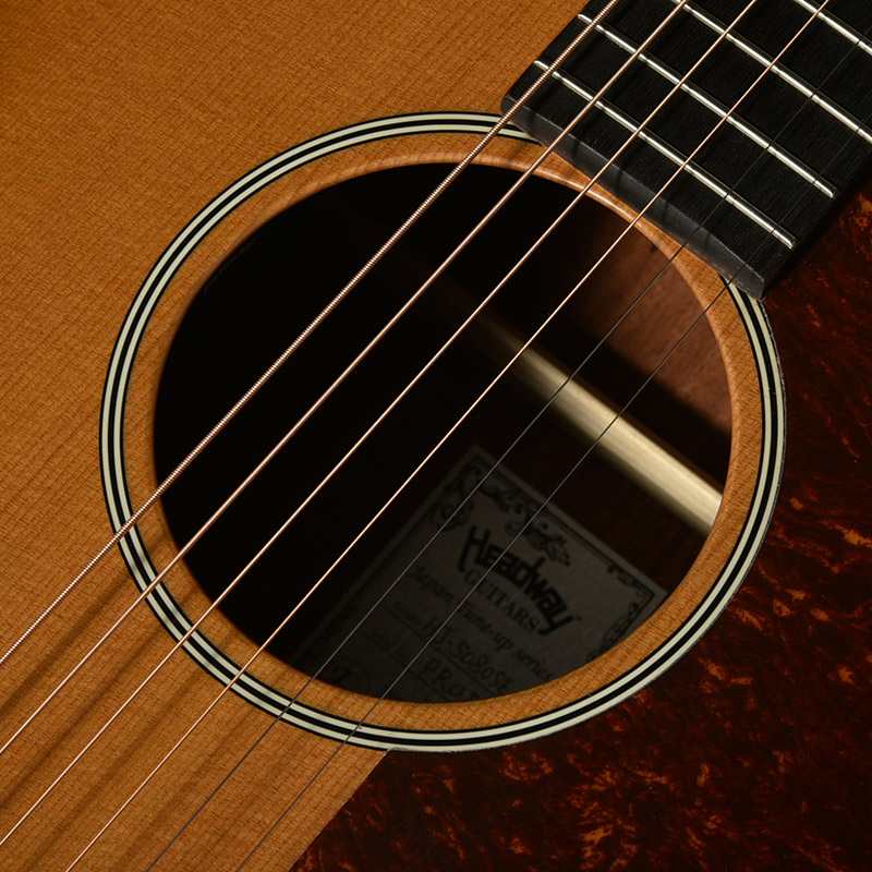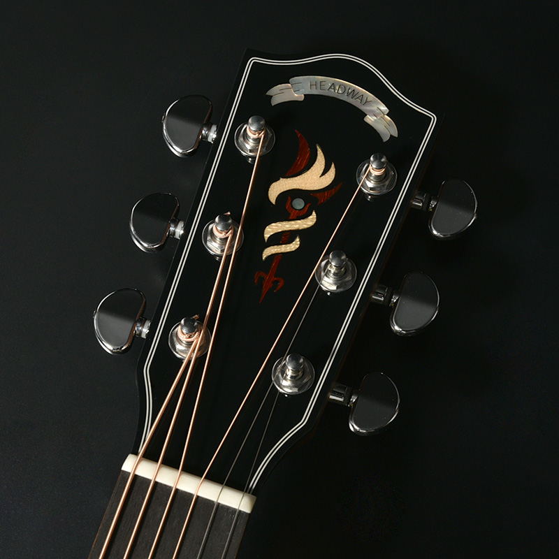 Headwayの500番シリーズのヘッドシェイプで、新しさと伝統を併せ持ったラウンドショルダースタイルの定番モデル。ボディは大ぶりではありますが、ドレッドノートスタイルと比べてスケールが短いため、押弦がしやすくソロギターなど細かい運指をされる方に人気があります。