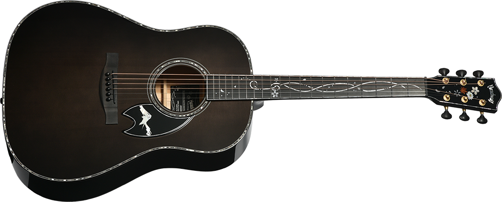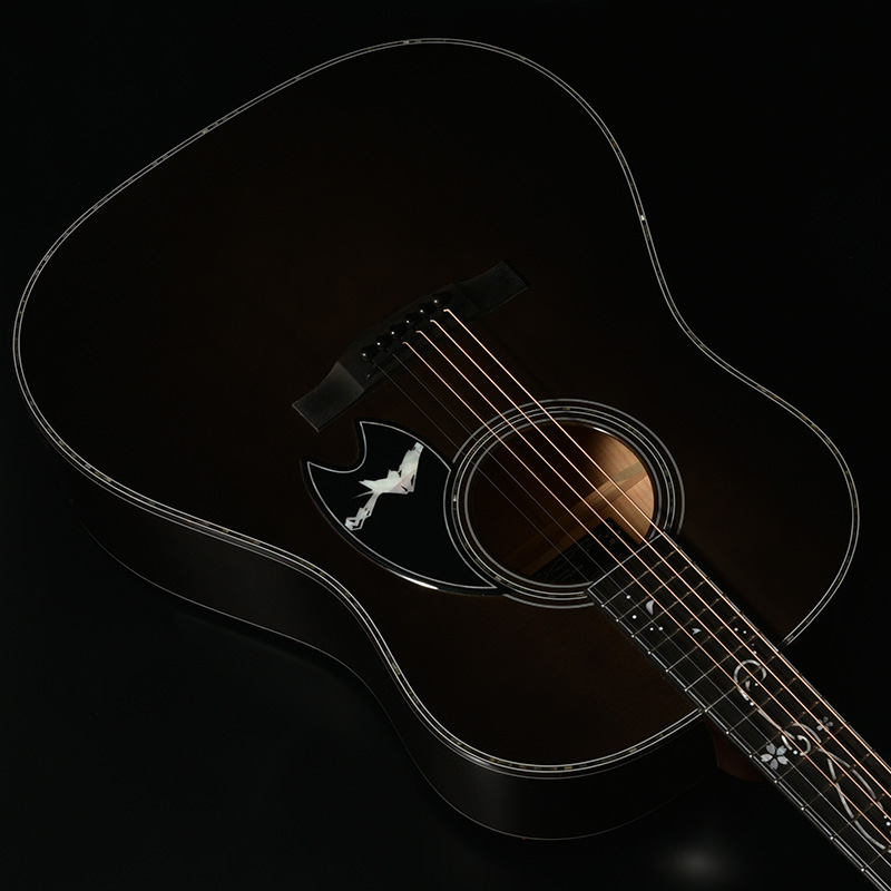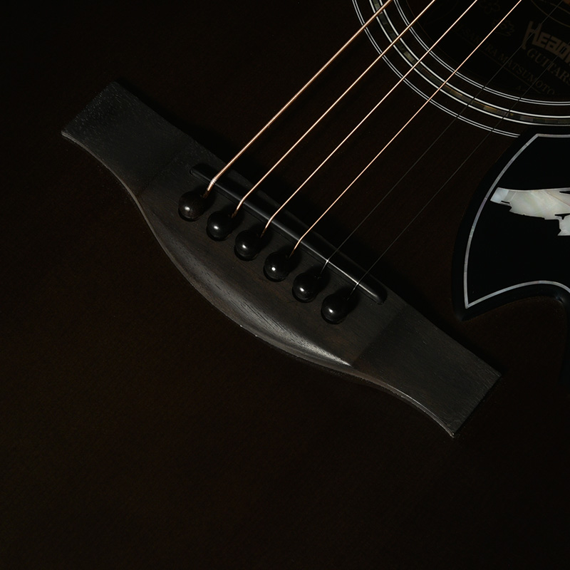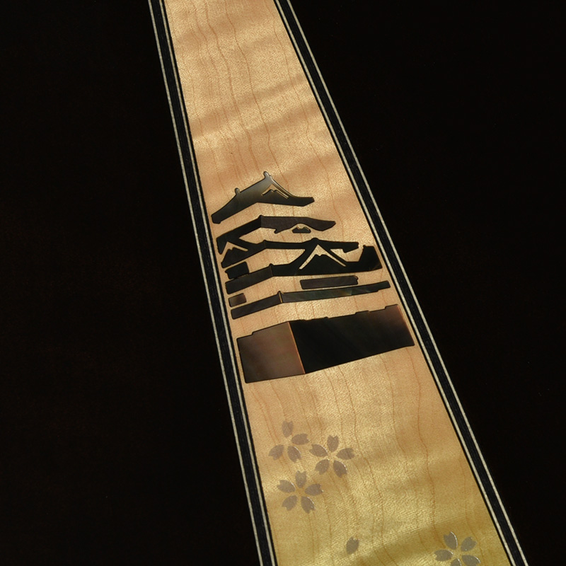 ボディのカラーリングは松本城の天守をイメージした”黒”で仕上げました。桜材の杢目を見せる黒の色合いは表現が難しく、数々のギターを塗り分けてきた職人の技と感覚で調色されています。