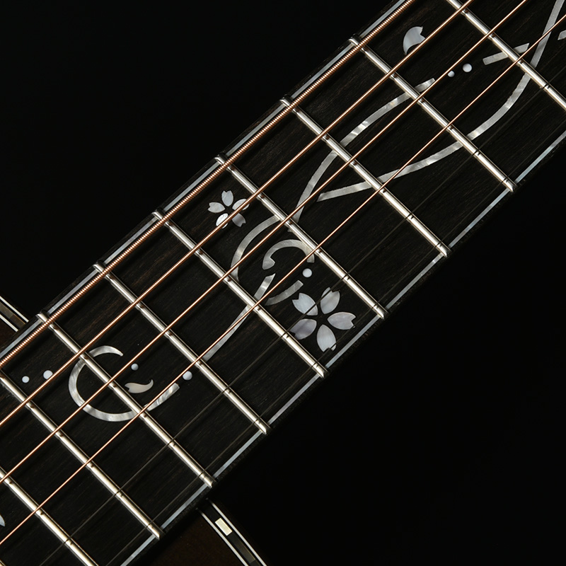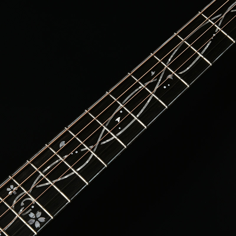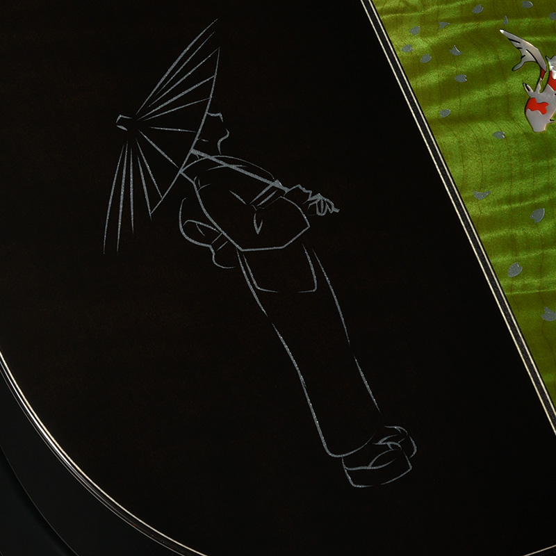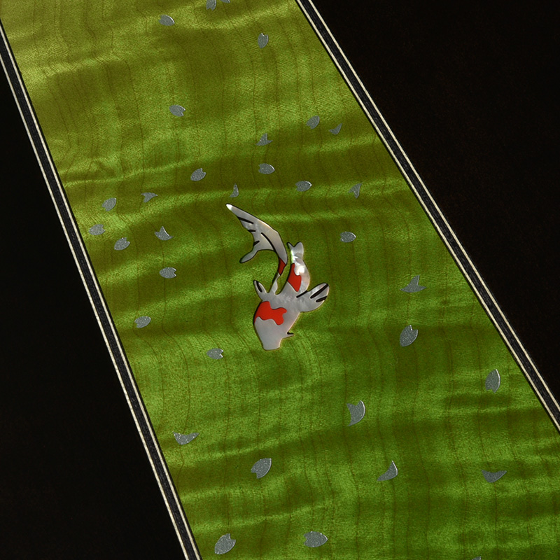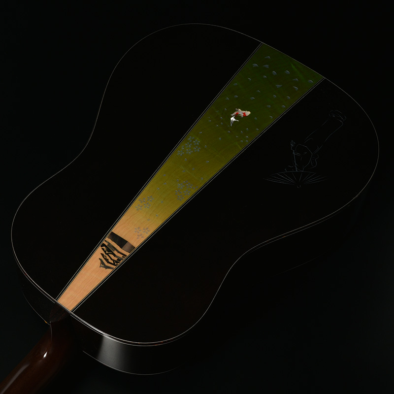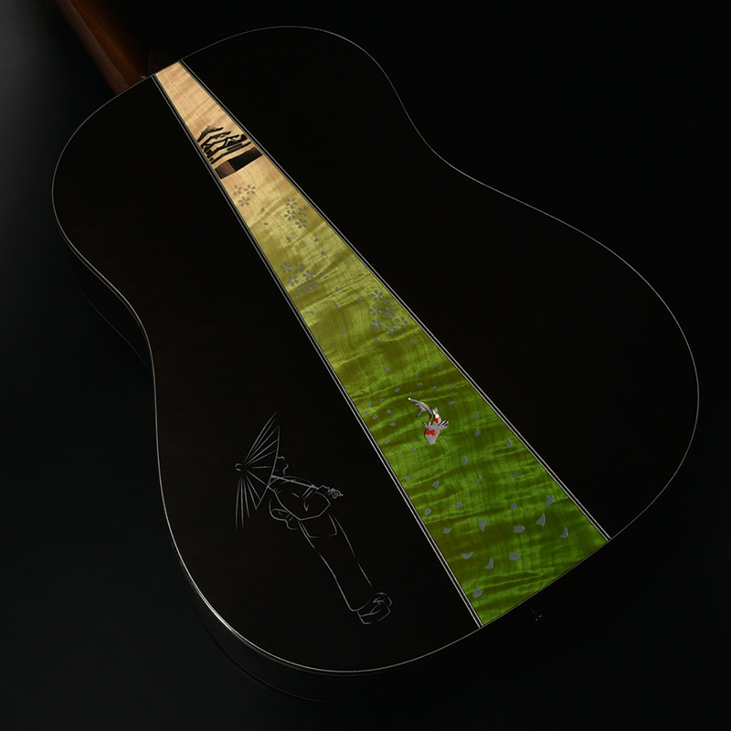 「桜ギター」の一番の特色であるボディサイド・バックの桜材は、私たちが”桜サウンド”と表現する、中音域に特徴のある音色を聞かせます。さらにボディバックセンターでは新緑に包まれた夏山をイメージした鮮やかなグリーンを配色し、季節の移ろいを表現しています。