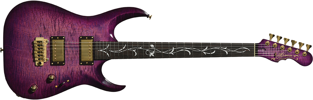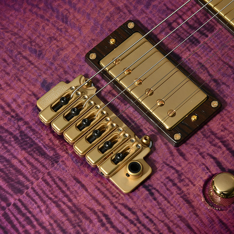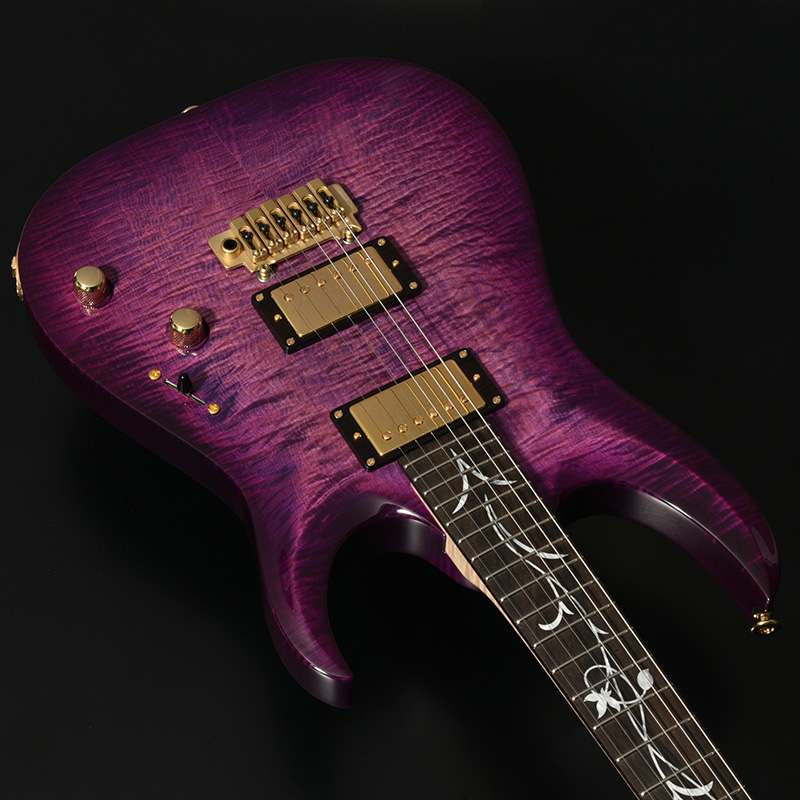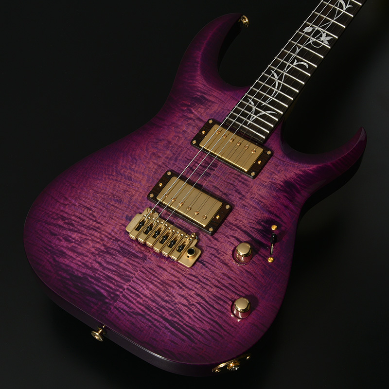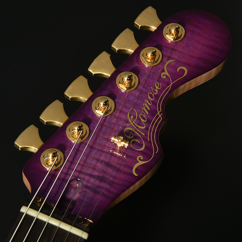 アーチトップが特徴的な新シェイプ”MA” (= Momose Advanced)に、ボディに極上の和材フレイムトチを採用した特別な一本が登場。その見た目のみならず、H-H配列のピックアップ、2点支持トレモロ、24F仕様、ジョイント部分のヒールレスカット、そしてコイルタップ機能と言った現代のミュージックシーンを意識した仕様を数多く取り入れたモダンスタイルが特徴です。