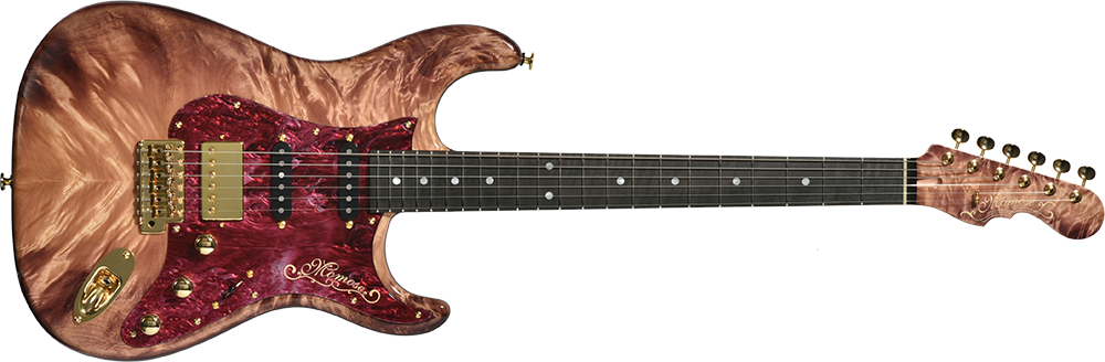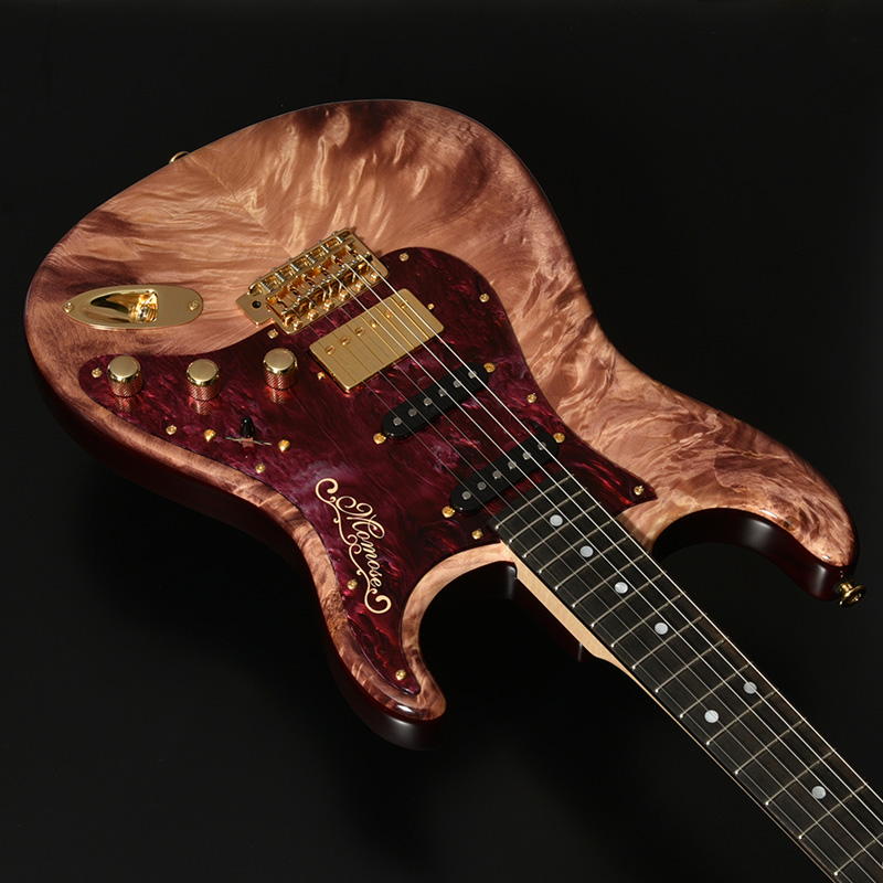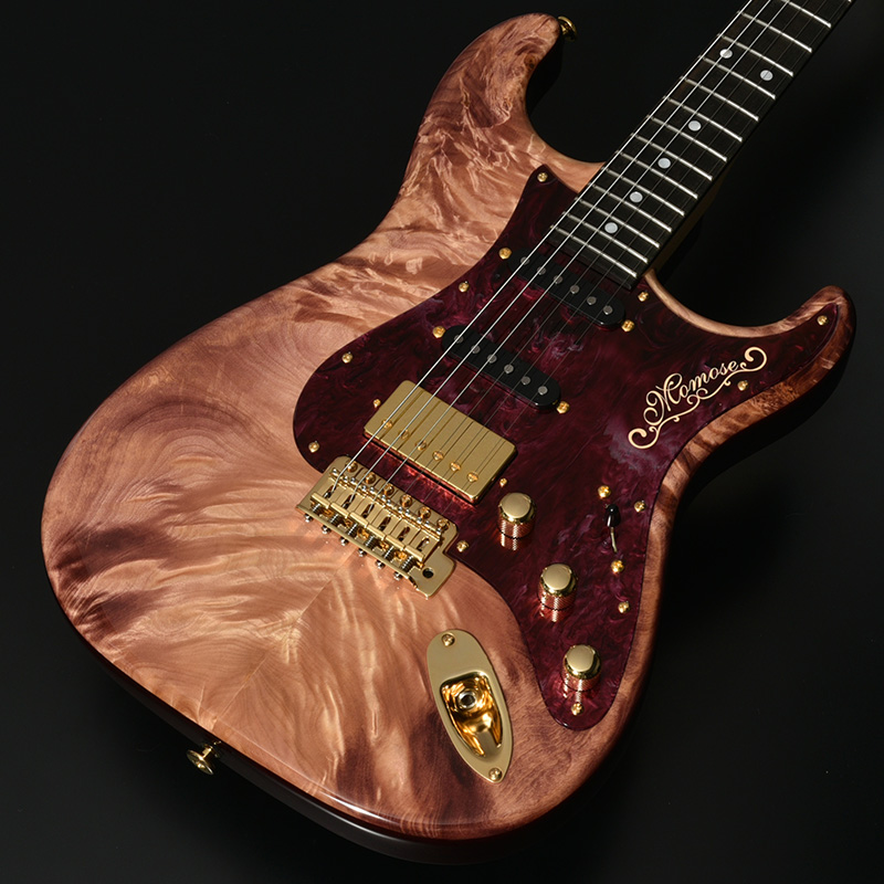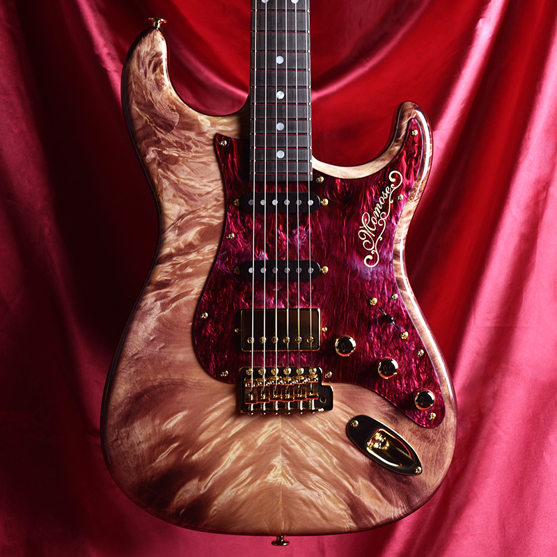 瘤杢(バール)の美しく現れたトチ材をボディトップに使用した一本です。バック材には近年入手が困難となった北米産のアッシュ材を1ピースで採用しています。