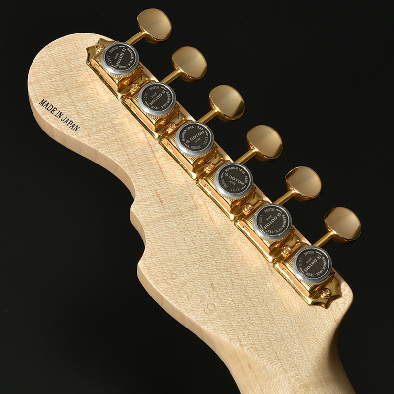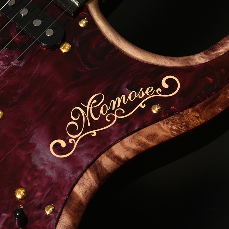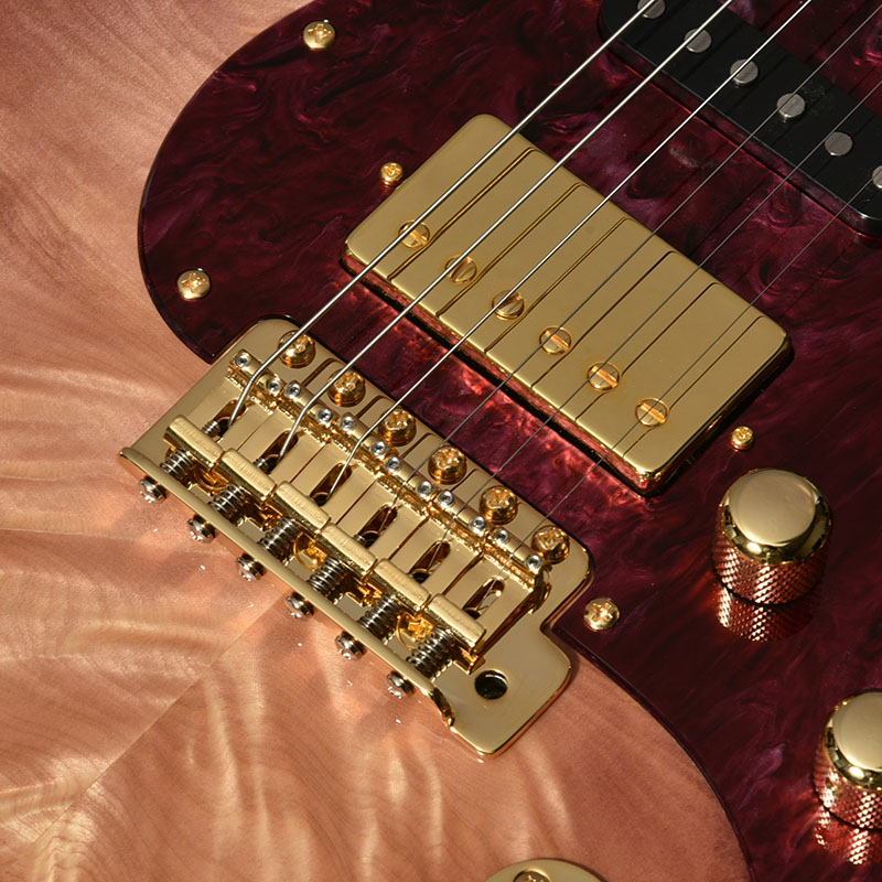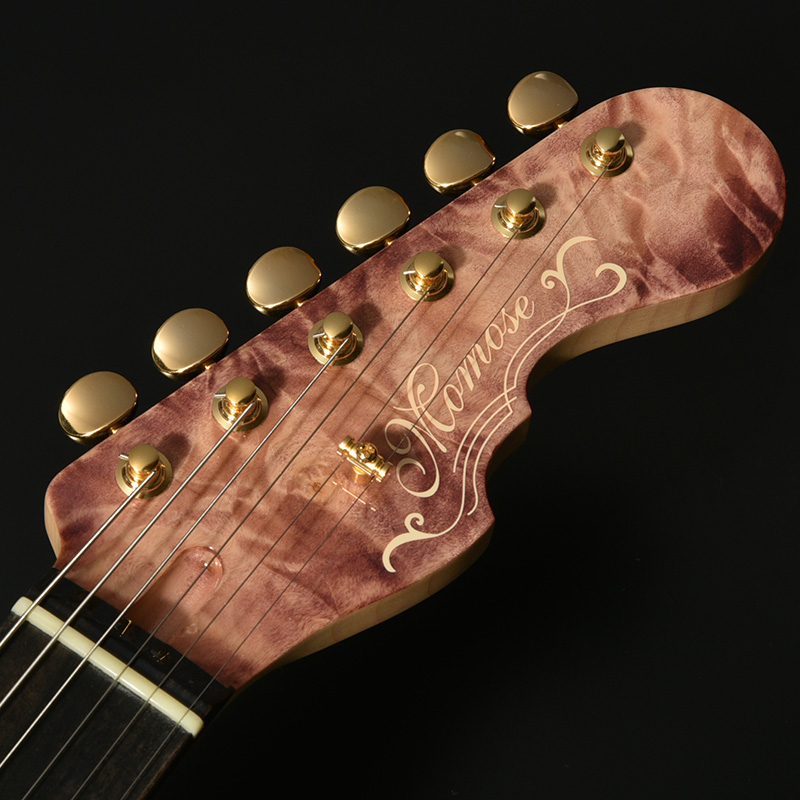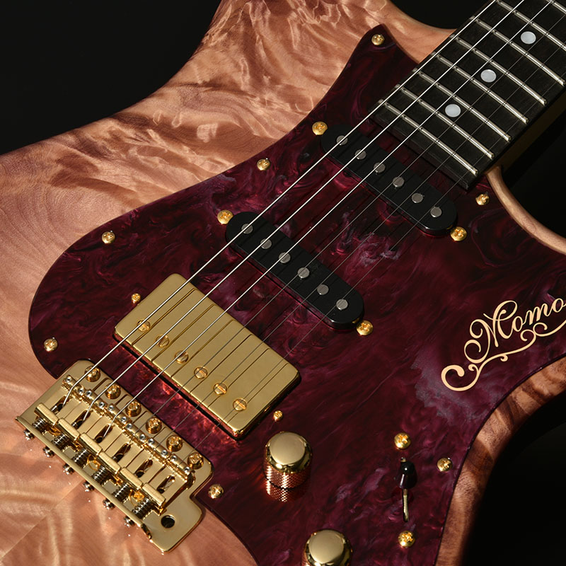 シングルコイルタイプのMomose「VS-1」と広いレンジをもつオリジナルハムバッカー「BEANO」を組み合わせたS-S-Hのピックアップ配列です。出力はやや低めに設定されており、木材の特性をナチュラルに引き出します。