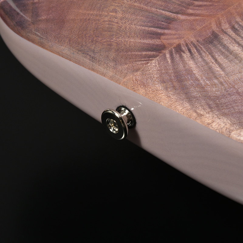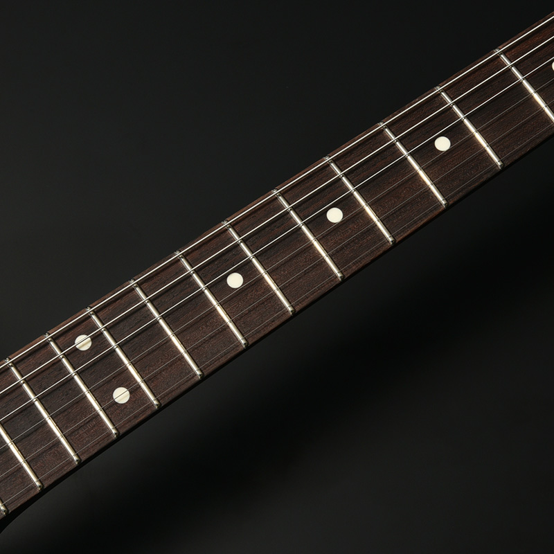 紫檀(したん)の和名を持つローズウッドの一種「インディアンローズウッド」は最もスタンダードな指板材のひとつであり、サウンド面でも実用性の高い仕様となっています。