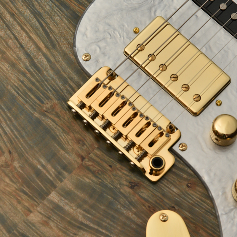 組み合わせるピックガードにはシルバーのアクリル素材を特注して製作しており、見る角度で揺らめく奥行きを感じる素材で、限定モデルだから使える特別なピックガードです。そこにゴールドのハードウェアを組み合わせ、ボディ色との対比をあえて作ることで、より一層杢目を引き立て目を引く1本に仕上がります。
