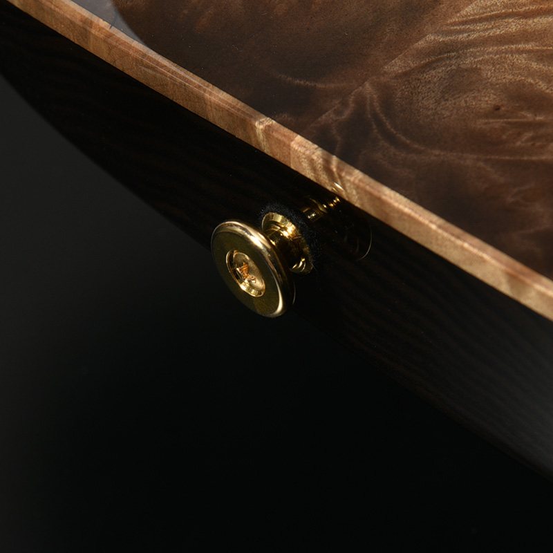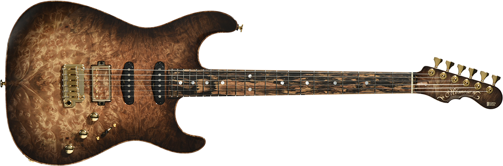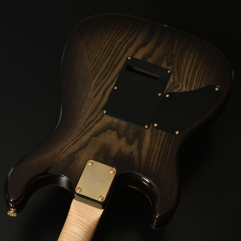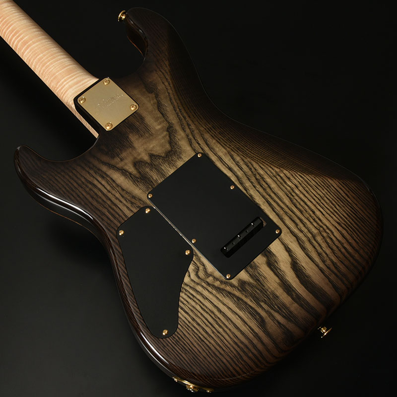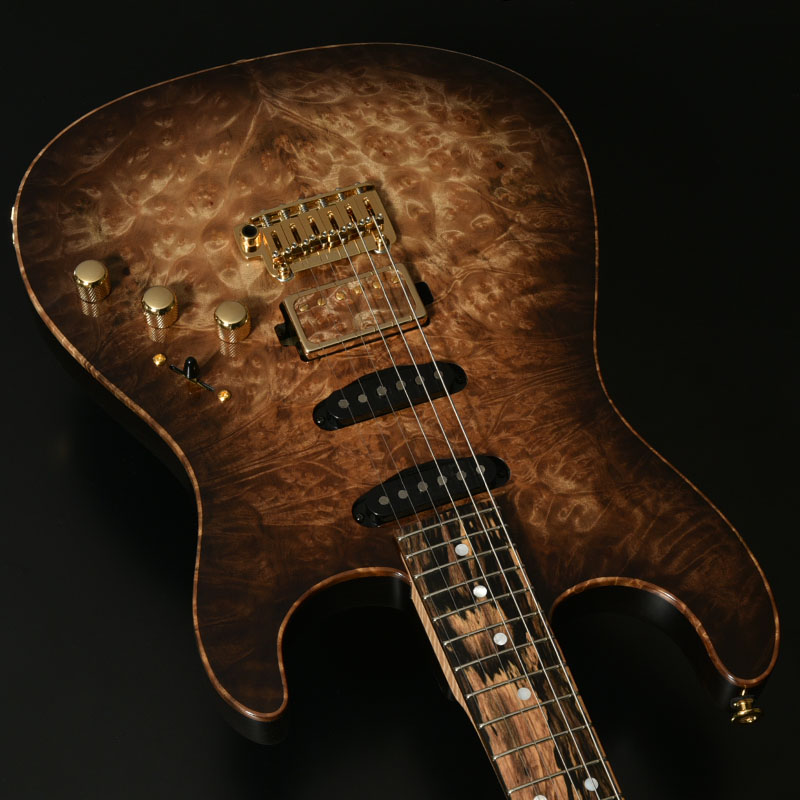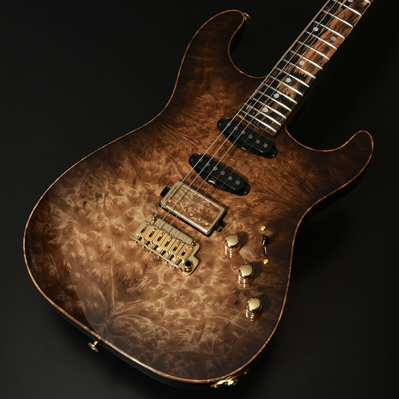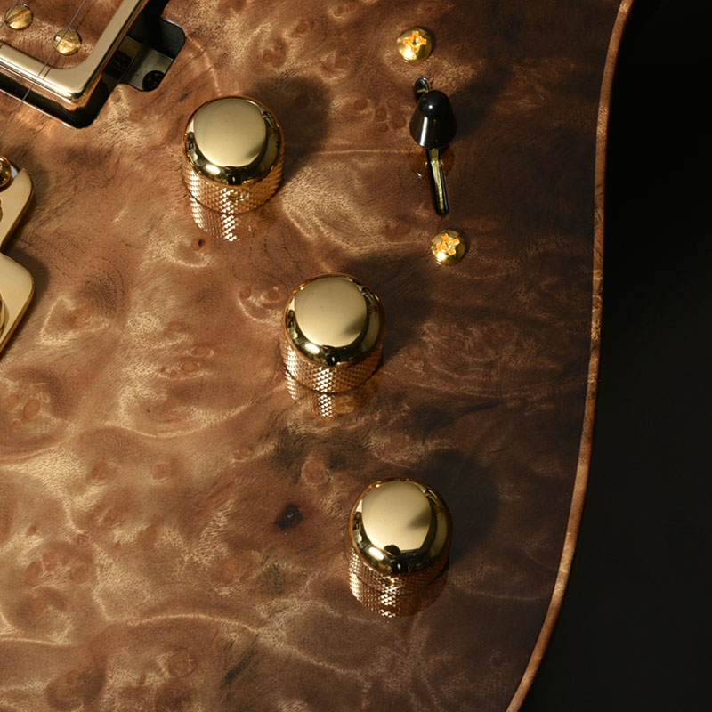 ボディトップには南米を原産とし、独特な杢目が特徴のマーブルウッドを採用。バール杢ともよく似たルックスで、抜群の存在感を放ちます。ボディ本体には「神代タモ」を採用。火山の噴火や地殻変動などの理由によりに地中に埋められて数百年~数千年以上の時を経た埋もれ木のことを『神代木』と呼びます。その性質から手に入れようと思っても手に入る木材では無く、土木工事などで地中を掘り返した時に運よく見つかることもあるといった非常に希少で貴重な材料となっております。