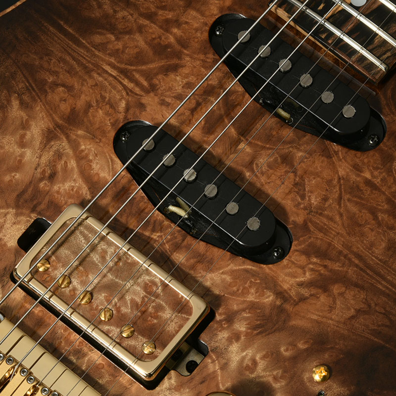 Modern Virtuosoシリーズ最大の特徴のひとつでもあるSSH配列ピックアップには、「Mojotone」をセレクト。ビンテージサウンドから連想される明瞭な輪郭を持つクリーントーンを志向して作られた”Classic”Strat®をフロントとセンターに配置。リアにはオリジナルPAFの音質をモデルとしながら低音をやや強調し、サスティーンが長くなるように調整した”Classic Hot Humbucker”を搭載。ピックアップカバー内にボディトップと同じ材をはめ込んで装飾することで、外観にも個性と統一感を持たせています。