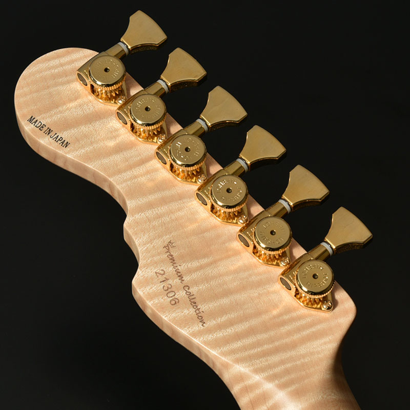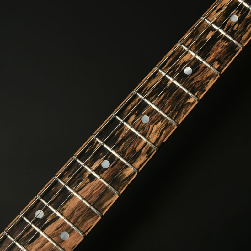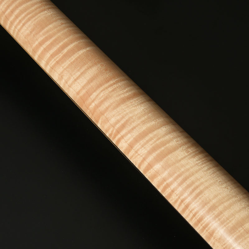 指板材にはペールムーンエボニーを使用。定番のローズウッドなどに比べて重量があり、音の立ち上がりが早く輪郭のあるトーンと伸びやかなサスティーンを生み出します。ネック材の柾目フレイムメイプルは、ヘッドストックの先端までストライプの入ったハイグレードな個体を厳選。芸術的なルックスをぜひその目でお確かめください。